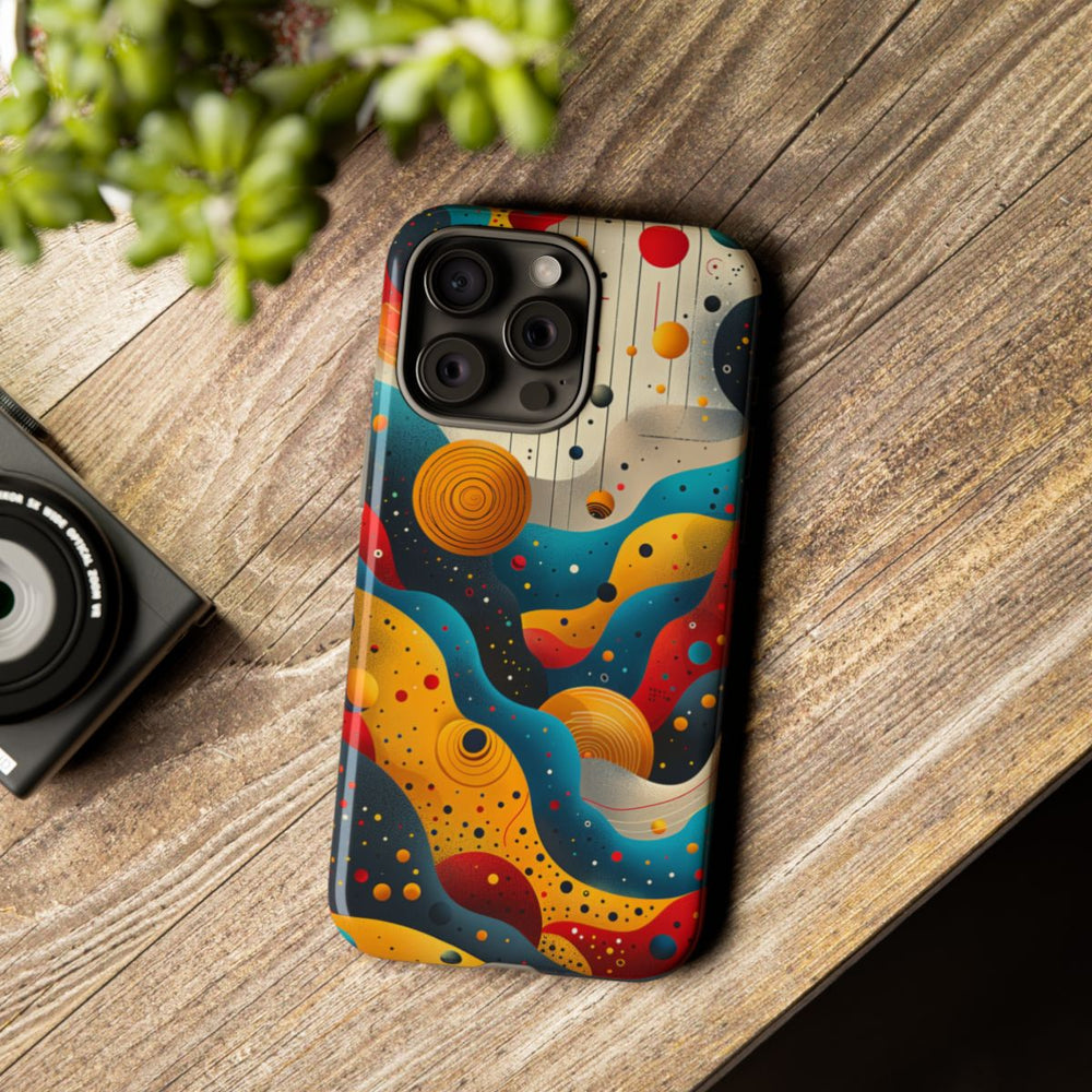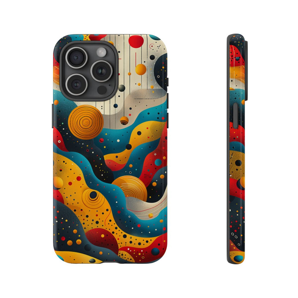 Dit hoesje heeft een abstract patroon met vloeiende golven en talloze ronde vormen die doen denken aan planeten of bollen. Het kleurgebruik bestaat uit levendige tinten rood, blauw, geel en zwart op een lichtbeige achtergrond. De compositie bevat gestippelde texturen en fijne lijnen die sommige bollen met elkaar verbinden, wat zorgt voor een dynamische en kosmische uitstraling. Het glanzende, stevige hoesje is gemaakt van een duurzame dubbele laag polycarbonaat en TPU voor extra bescherming en is geschikt voor draadloos opladen.