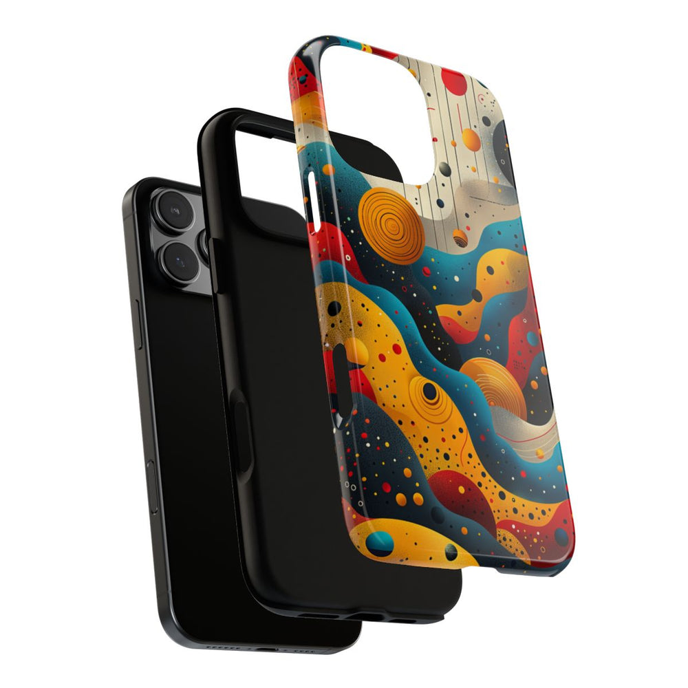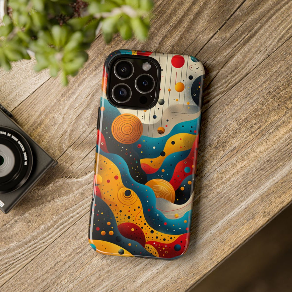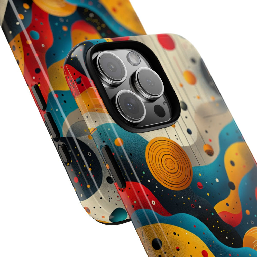 Dit hoesje heeft een abstract patroon met vloeiende golven en talloze ronde vormen die doen denken aan planeten of bollen. Het kleurgebruik bestaat uit levendige tinten rood, blauw, geel en zwart op een lichtbeige achtergrond. De compositie bevat gestippelde texturen en fijne lijnen die sommige bollen met elkaar verbinden, wat zorgt voor een dynamische en kosmische uitstraling. Het glanzende, stevige hoesje is gemaakt van een duurzame dubbele laag polycarbonaat en TPU voor extra bescherming en is geschikt voor draadloos opladen.