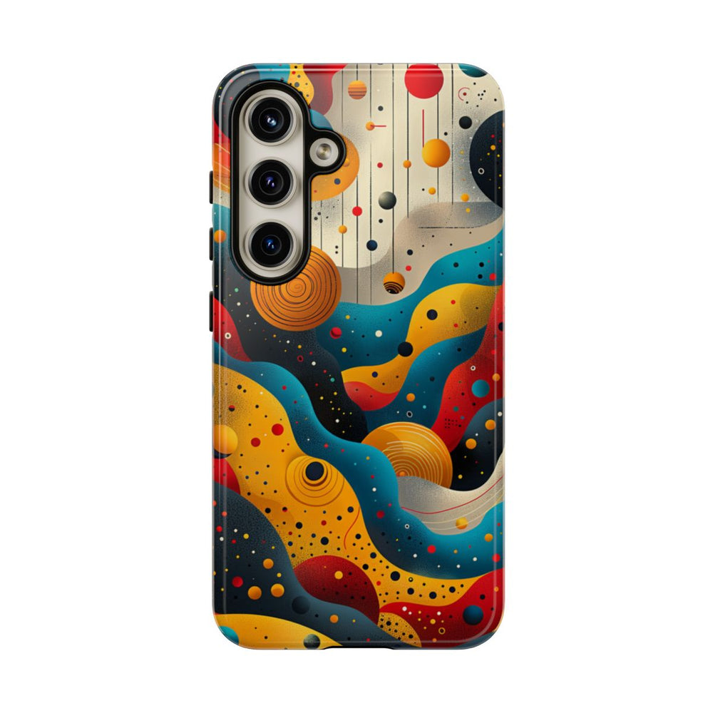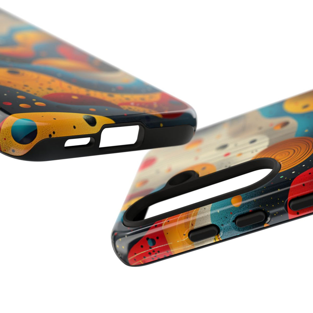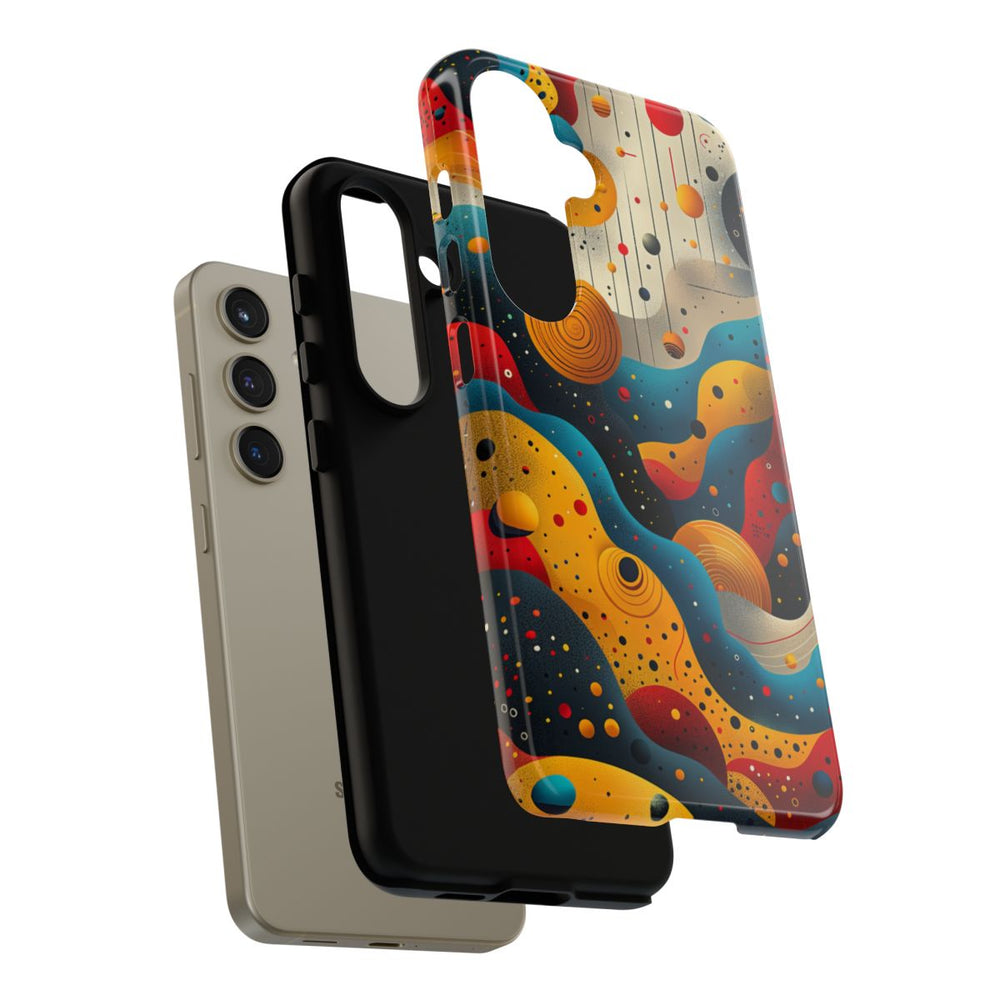 Dit hoesje heeft een abstract patroon met vloeiende golven en talloze ronde vormen die doen denken aan planeten of bollen. Het kleurgebruik bestaat uit levendige tinten rood, blauw, geel en zwart op een lichtbeige achtergrond. De compositie bevat gestippelde texturen en fijne lijnen die sommige bollen met elkaar verbinden, wat zorgt voor een dynamische en kosmische uitstraling. Het glanzende, stevige hoesje is gemaakt van een duurzame dubbele laag polycarbonaat en TPU voor extra bescherming en is geschikt voor draadloos opladen.