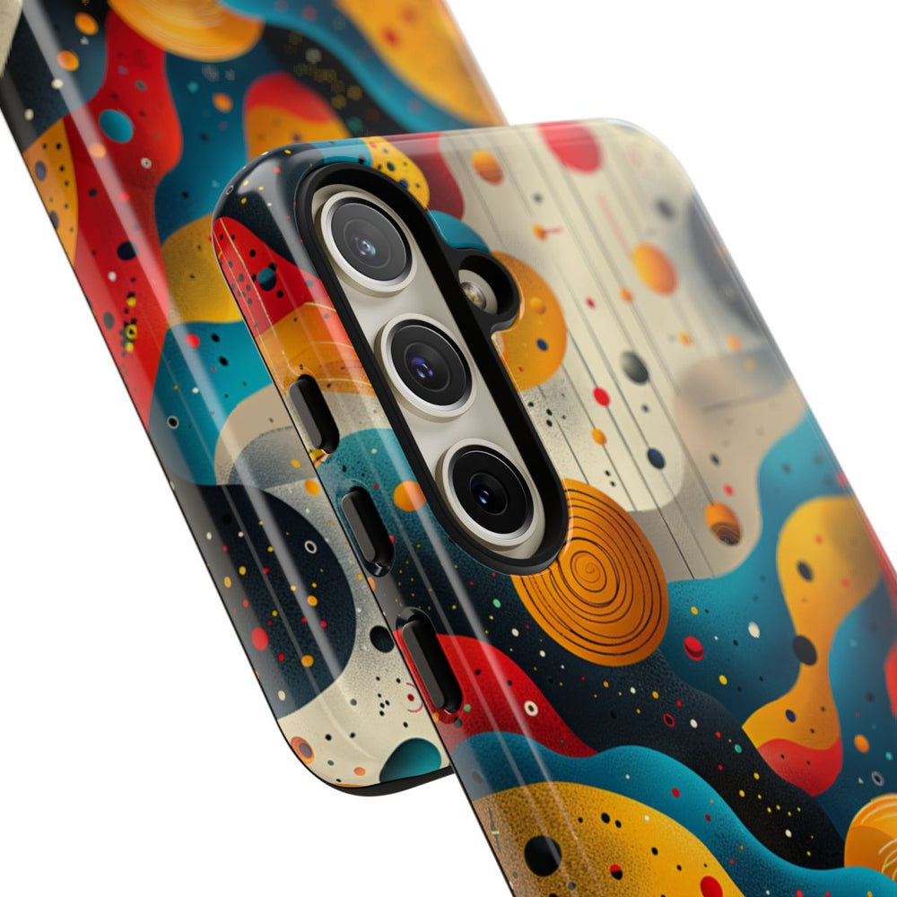 Dit hoesje heeft een abstract patroon met vloeiende golven en talloze ronde vormen die doen denken aan planeten of bollen. Het kleurgebruik bestaat uit levendige tinten rood, blauw, geel en zwart op een lichtbeige achtergrond. De compositie bevat gestippelde texturen en fijne lijnen die sommige bollen met elkaar verbinden, wat zorgt voor een dynamische en kosmische uitstraling. Het glanzende, stevige hoesje is gemaakt van een duurzame dubbele laag polycarbonaat en TPU voor extra bescherming en is geschikt voor draadloos opladen.