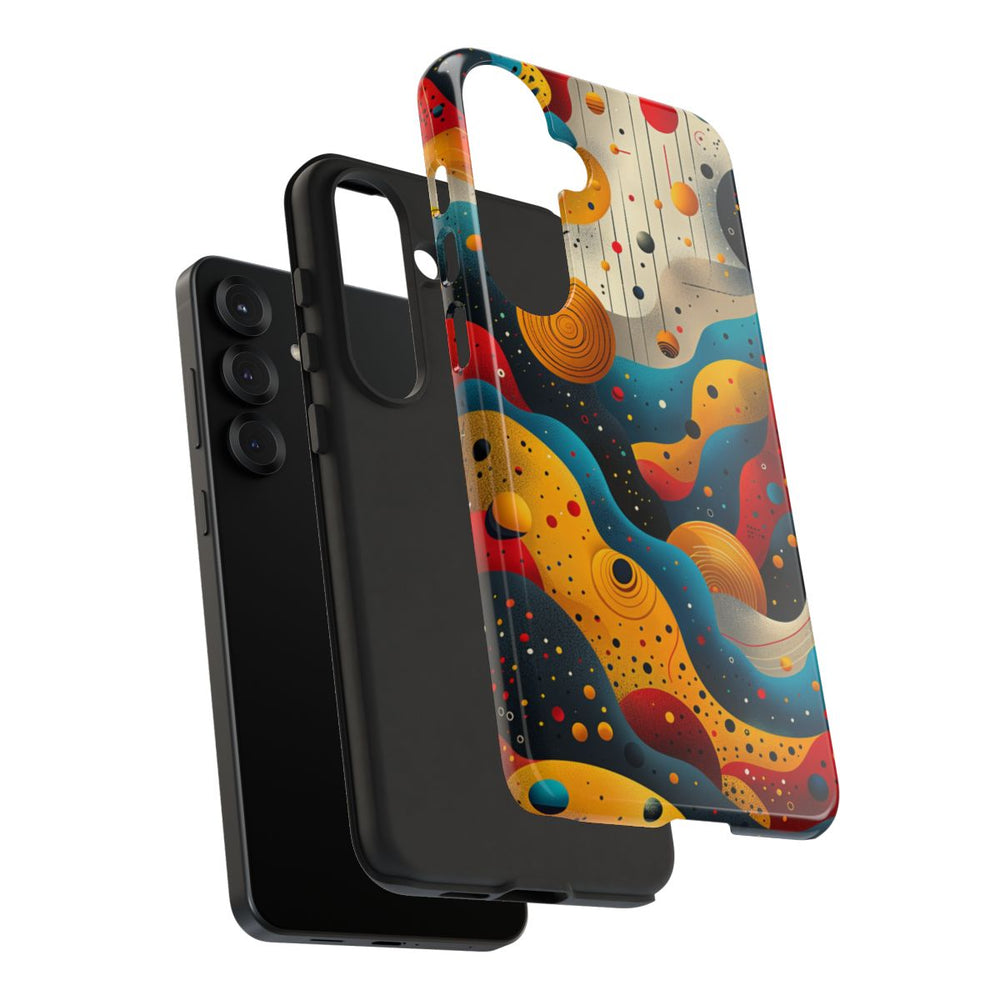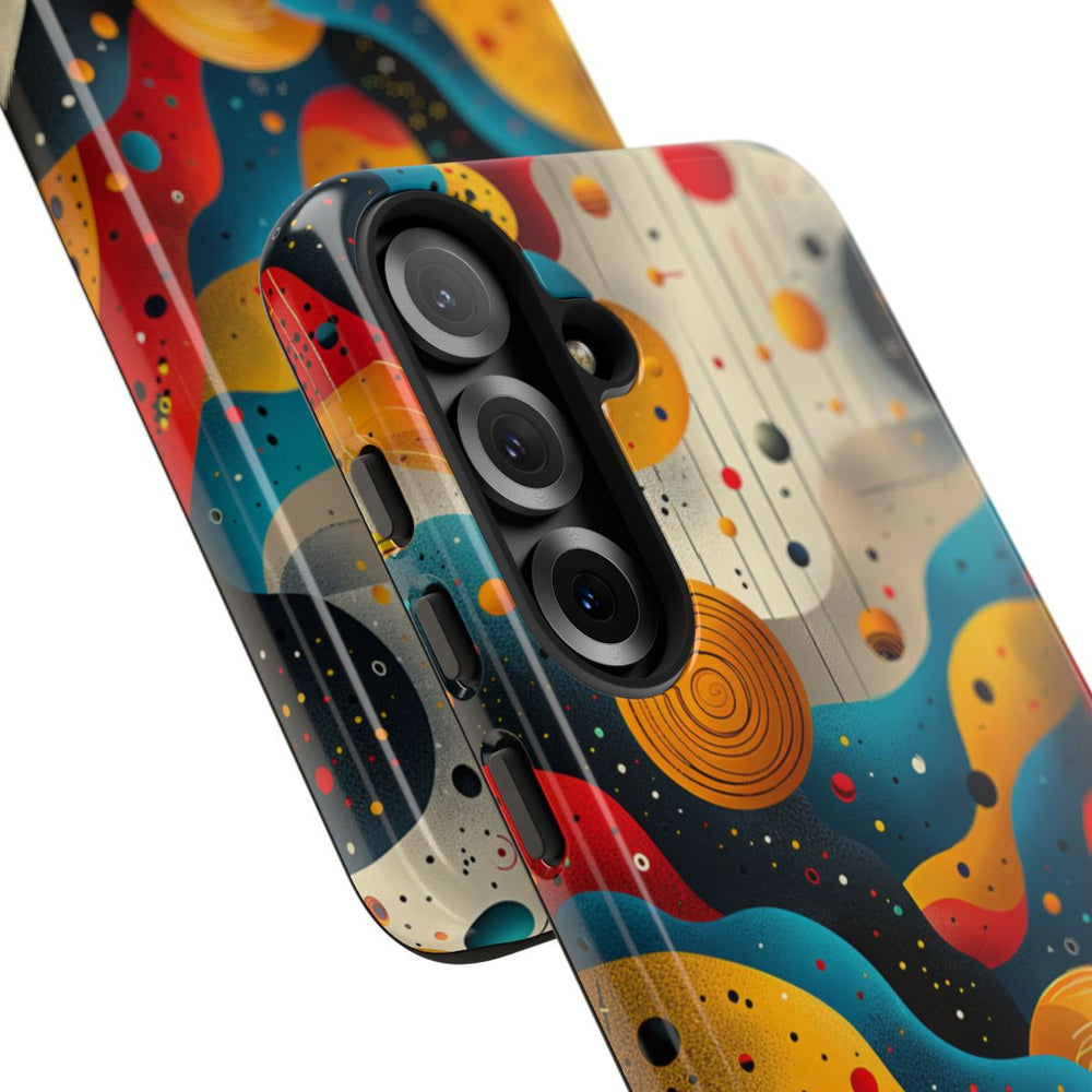 Dit hoesje heeft een abstract patroon met vloeiende golven en talloze ronde vormen die doen denken aan planeten of bollen. Het kleurgebruik bestaat uit levendige tinten rood, blauw, geel en zwart op een lichtbeige achtergrond. De compositie bevat gestippelde texturen en fijne lijnen die sommige bollen met elkaar verbinden, wat zorgt voor een dynamische en kosmische uitstraling. Het glanzende, stevige hoesje is gemaakt van een duurzame dubbele laag polycarbonaat en TPU voor extra bescherming en is geschikt voor draadloos opladen.