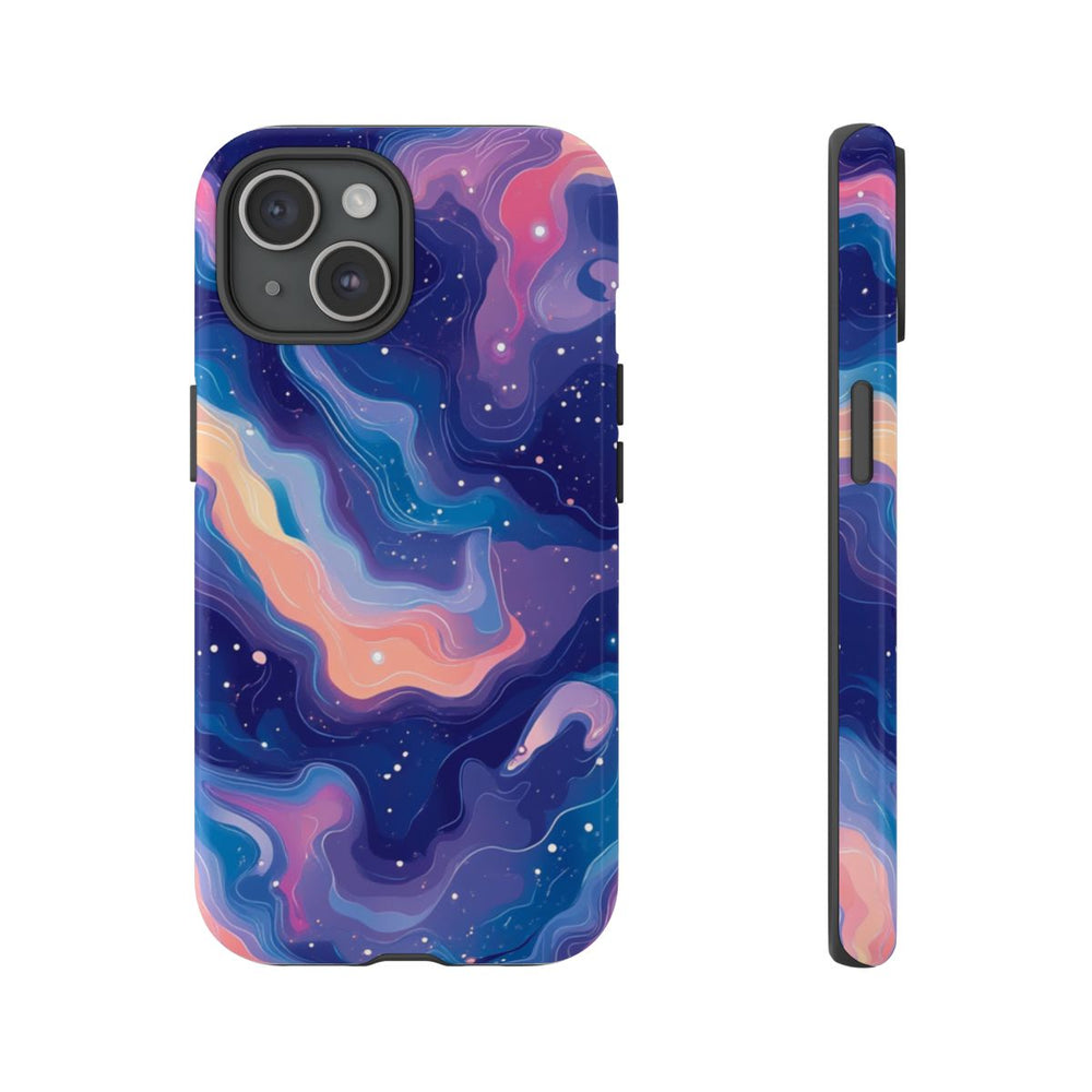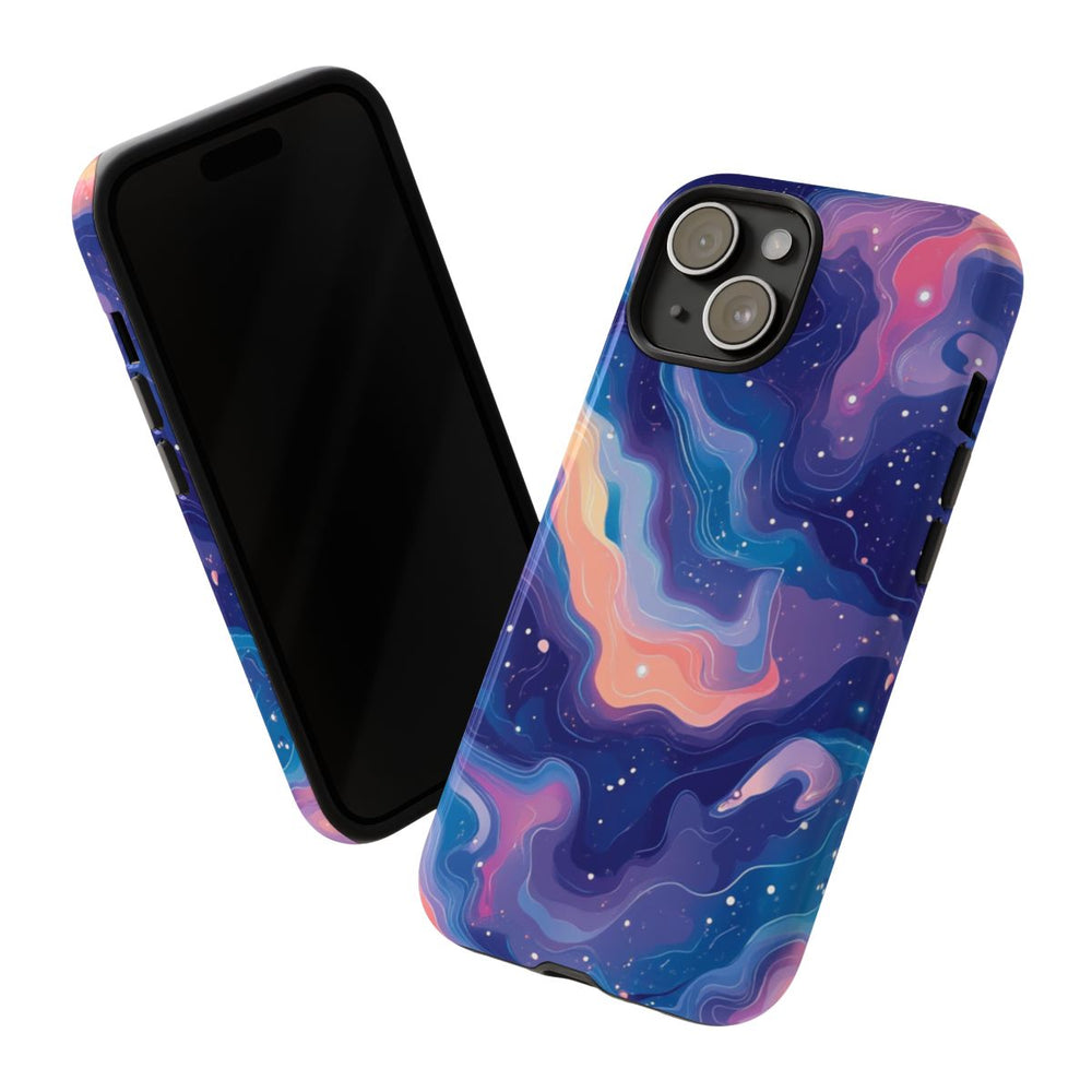 Dit ontwerp heeft een abstract kosmisch patroon met wervelende vormen in levendige pastelkleuren, zoals blauw, paars, roze en perzik. De achtergrond is diep donkerblauw en bezaaid met kleine witte stippen die op sterren lijken, wat zorgt voor een dromerig, ruimtelijk effect. Het patroon is vloeiend en dynamisch, met gelaagde contouren die diepte en beweging toevoegen. Dit glanzende, stevige hoesje is gemaakt van een dubbele laag met een polycarbonaat buitenkant en TPU-binnenzijde, voor duurzaamheid en bescherming. Ondersteunt draadloos opladen.