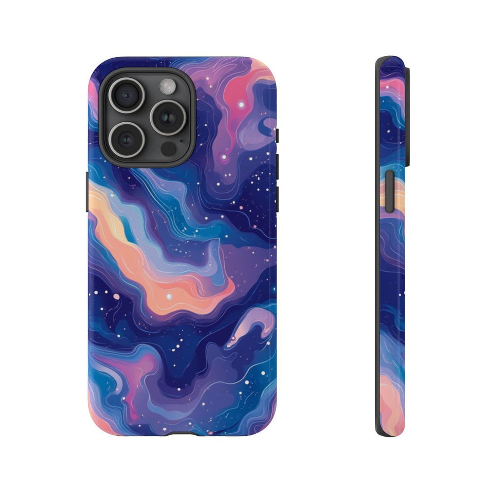 Dit ontwerp heeft een abstract kosmisch patroon met wervelende vormen in levendige pastelkleuren, zoals blauw, paars, roze en perzik. De achtergrond is diep donkerblauw en bezaaid met kleine witte stippen die op sterren lijken, wat zorgt voor een dromerig, ruimtelijk effect. Het patroon is vloeiend en dynamisch, met gelaagde contouren die diepte en beweging toevoegen. Dit glanzende, stevige hoesje is gemaakt van een dubbele laag met een polycarbonaat buitenkant en TPU-binnenzijde, voor duurzaamheid en bescherming. Ondersteunt draadloos opladen.