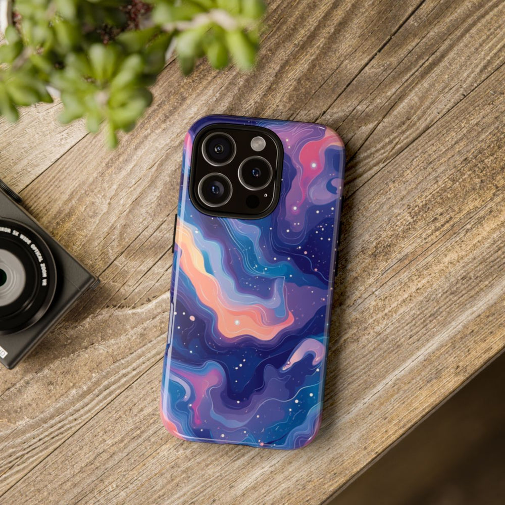 Dit ontwerp heeft een abstract kosmisch patroon met wervelende vormen in levendige pastelkleuren, zoals blauw, paars, roze en perzik. De achtergrond is diep donkerblauw en bezaaid met kleine witte stippen die op sterren lijken, wat zorgt voor een dromerig, ruimtelijk effect. Het patroon is vloeiend en dynamisch, met gelaagde contouren die diepte en beweging toevoegen. Dit glanzende, stevige hoesje is gemaakt van een dubbele laag met een polycarbonaat buitenkant en TPU-binnenzijde, voor duurzaamheid en bescherming. Ondersteunt draadloos opladen.