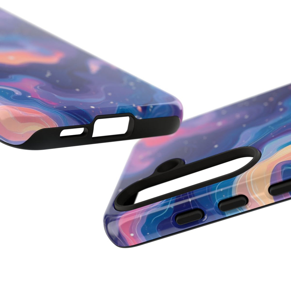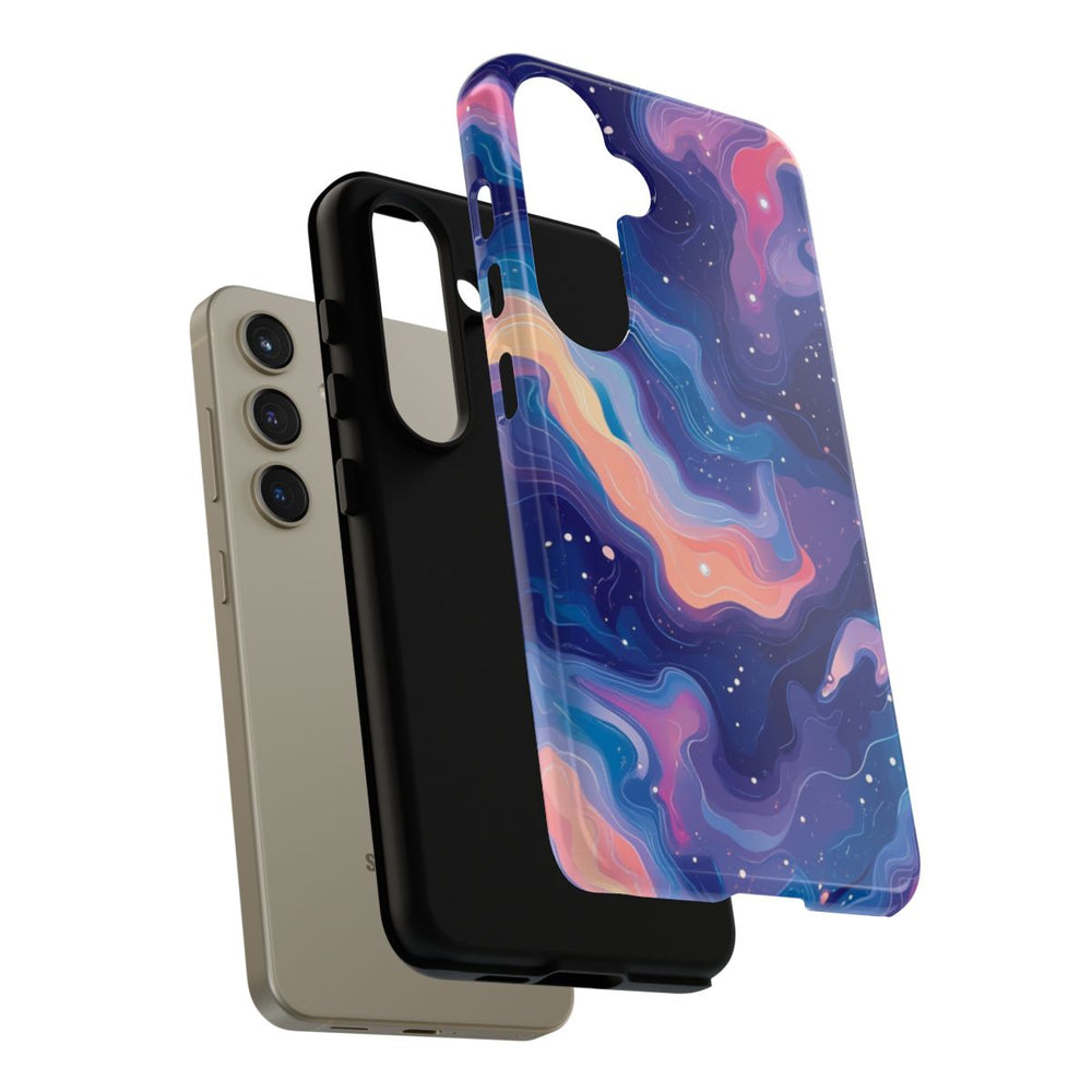Dit ontwerp heeft een abstract kosmisch patroon met wervelende vormen in levendige pastelkleuren, zoals blauw, paars, roze en perzik. De achtergrond is diep donkerblauw en bezaaid met kleine witte stippen die op sterren lijken, wat zorgt voor een dromerig, ruimtelijk effect. Het patroon is vloeiend en dynamisch, met gelaagde contouren die diepte en beweging toevoegen. Dit glanzende, stevige hoesje is gemaakt van een dubbele laag met een polycarbonaat buitenkant en TPU-binnenzijde, voor duurzaamheid en bescherming. Ondersteunt draadloos opladen.