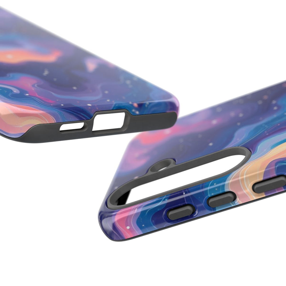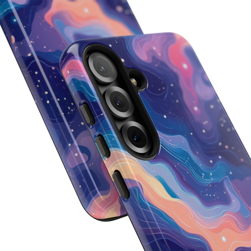 Dit ontwerp heeft een abstract kosmisch patroon met wervelende vormen in levendige pastelkleuren, zoals blauw, paars, roze en perzik. De achtergrond is diep donkerblauw en bezaaid met kleine witte stippen die op sterren lijken, wat zorgt voor een dromerig, ruimtelijk effect. Het patroon is vloeiend en dynamisch, met gelaagde contouren die diepte en beweging toevoegen. Dit glanzende, stevige hoesje is gemaakt van een dubbele laag met een polycarbonaat buitenkant en TPU-binnenzijde, voor duurzaamheid en bescherming. Ondersteunt draadloos opladen.