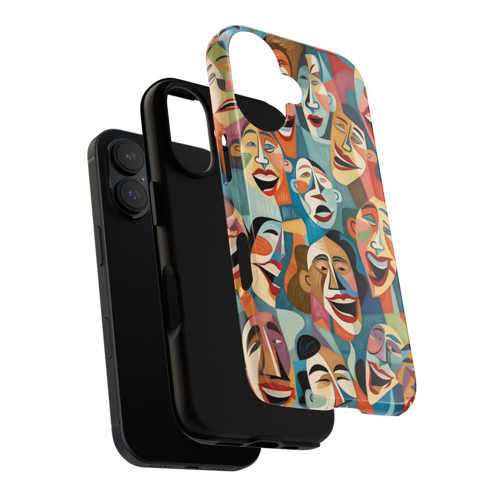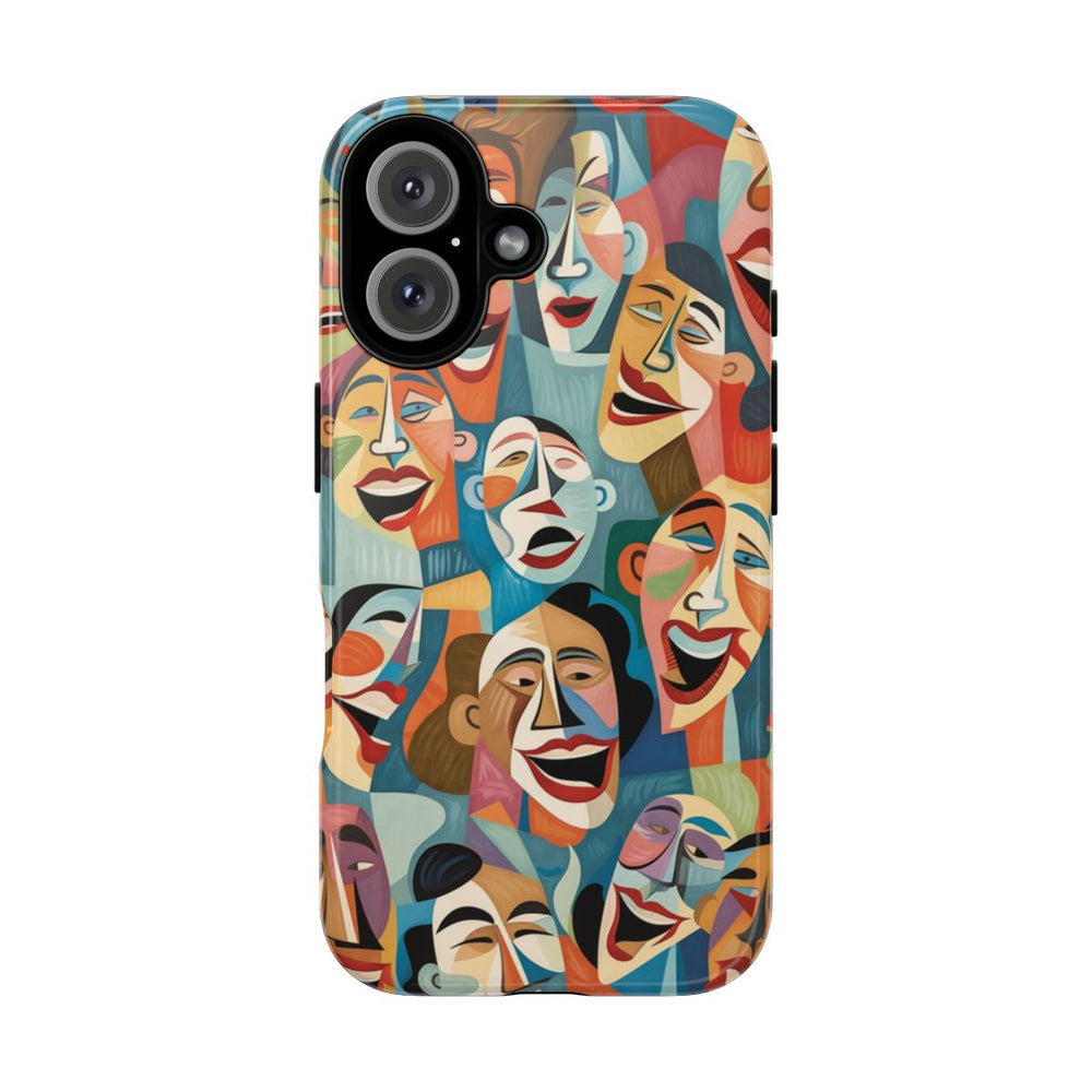 Dit ontwerp toont een levendige verzameling abstracte gezichten die allemaal lachen en vreugde uitstralen. De gezichten zijn opgebouwd uit geometrische vormen en opvallende lijnen, met een mix van warme en koele tinten zoals blauw, oranje, rood en groen. De stijl doet denken aan het kubisme, met overlappende en gefragmenteerde gelaatstrekken. Deze afbeelding is gedrukt op een glanzend, stevig hoesje van duurzaam polycarbonaat en TPU. Het hoesje biedt dubbele bescherming en ondersteunt draadloos opladen.