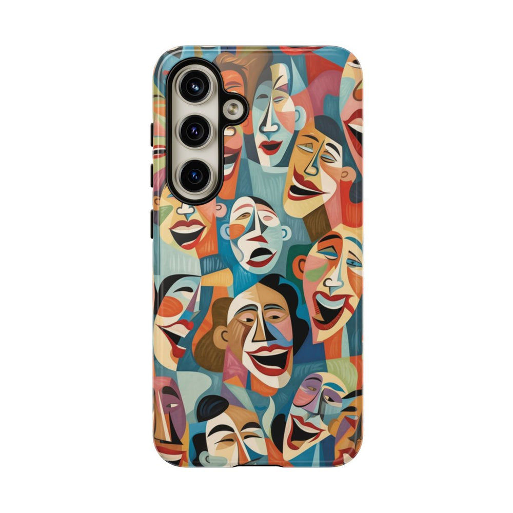Dit ontwerp toont een levendige verzameling abstracte gezichten die allemaal lachen en vreugde uitstralen. De gezichten zijn opgebouwd uit geometrische vormen en opvallende lijnen, met een mix van warme en koele tinten zoals blauw, oranje, rood en groen. De stijl doet denken aan het kubisme, met overlappende en gefragmenteerde gelaatstrekken. Deze afbeelding is gedrukt op een glanzend, stevig hoesje van duurzaam polycarbonaat en TPU. Het hoesje biedt dubbele bescherming en ondersteunt draadloos opladen.