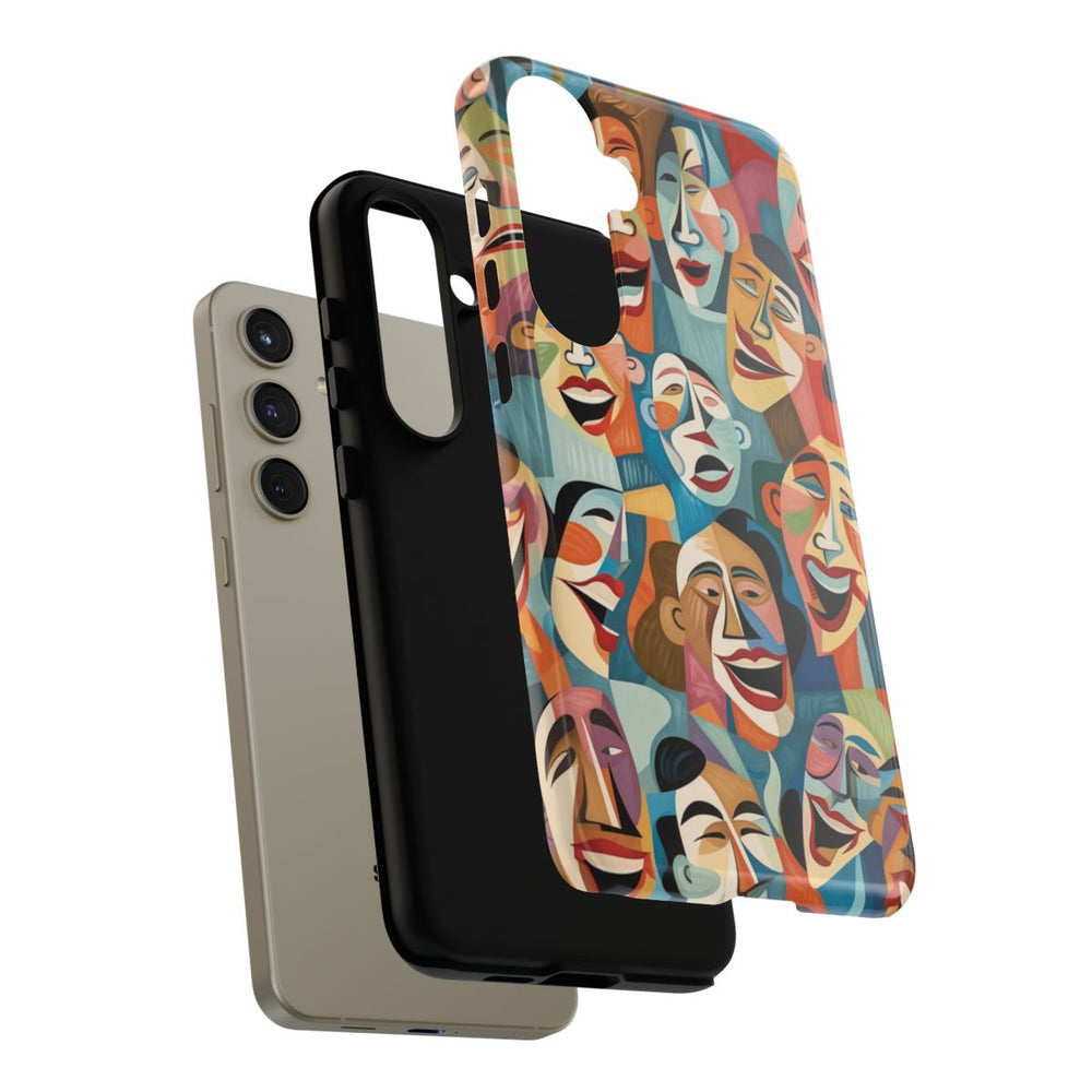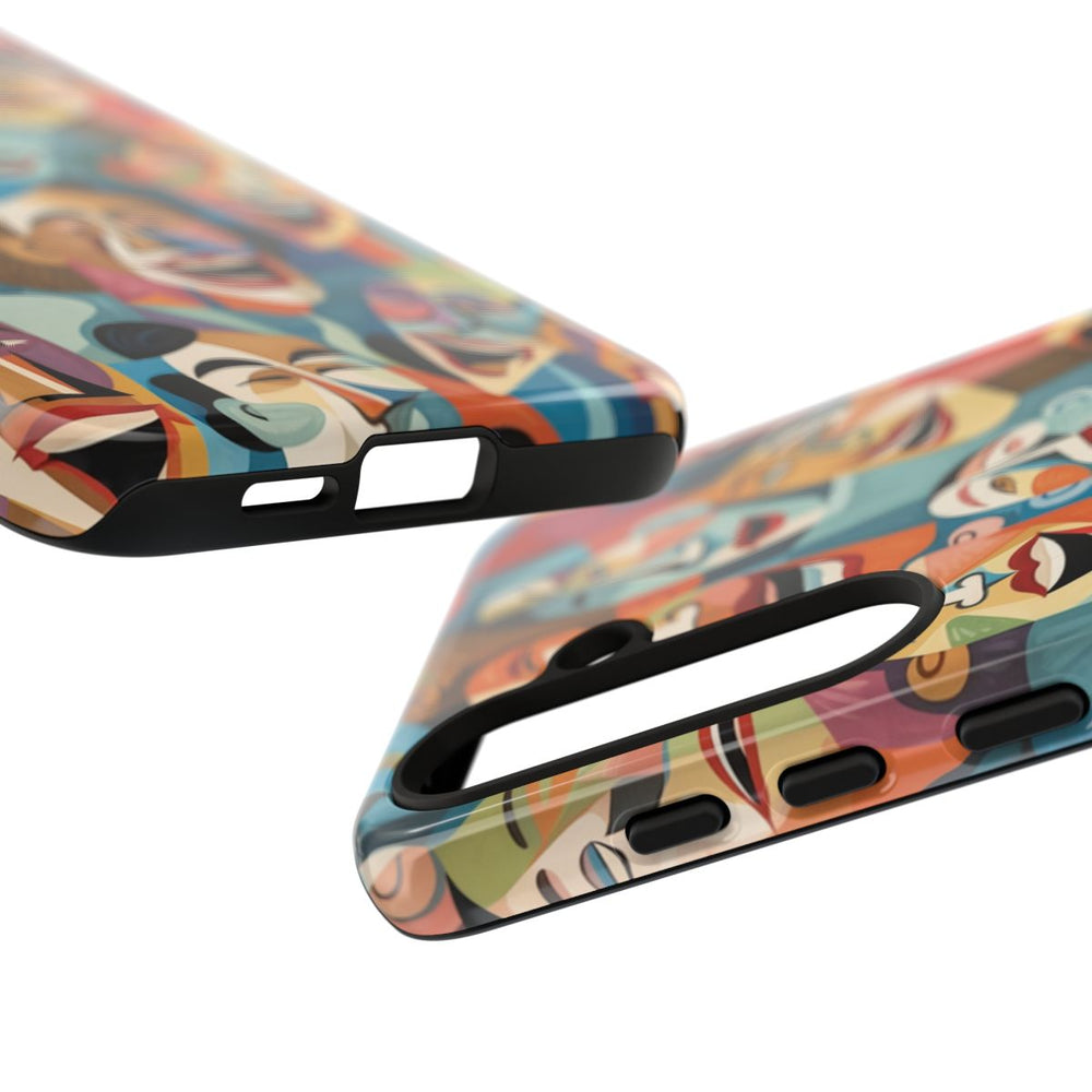 Dit ontwerp toont een levendige verzameling abstracte gezichten die allemaal lachen en vreugde uitstralen. De gezichten zijn opgebouwd uit geometrische vormen en opvallende lijnen, met een mix van warme en koele tinten zoals blauw, oranje, rood en groen. De stijl doet denken aan het kubisme, met overlappende en gefragmenteerde gelaatstrekken. Deze afbeelding is gedrukt op een glanzend, stevig hoesje van duurzaam polycarbonaat en TPU. Het hoesje biedt dubbele bescherming en ondersteunt draadloos opladen.