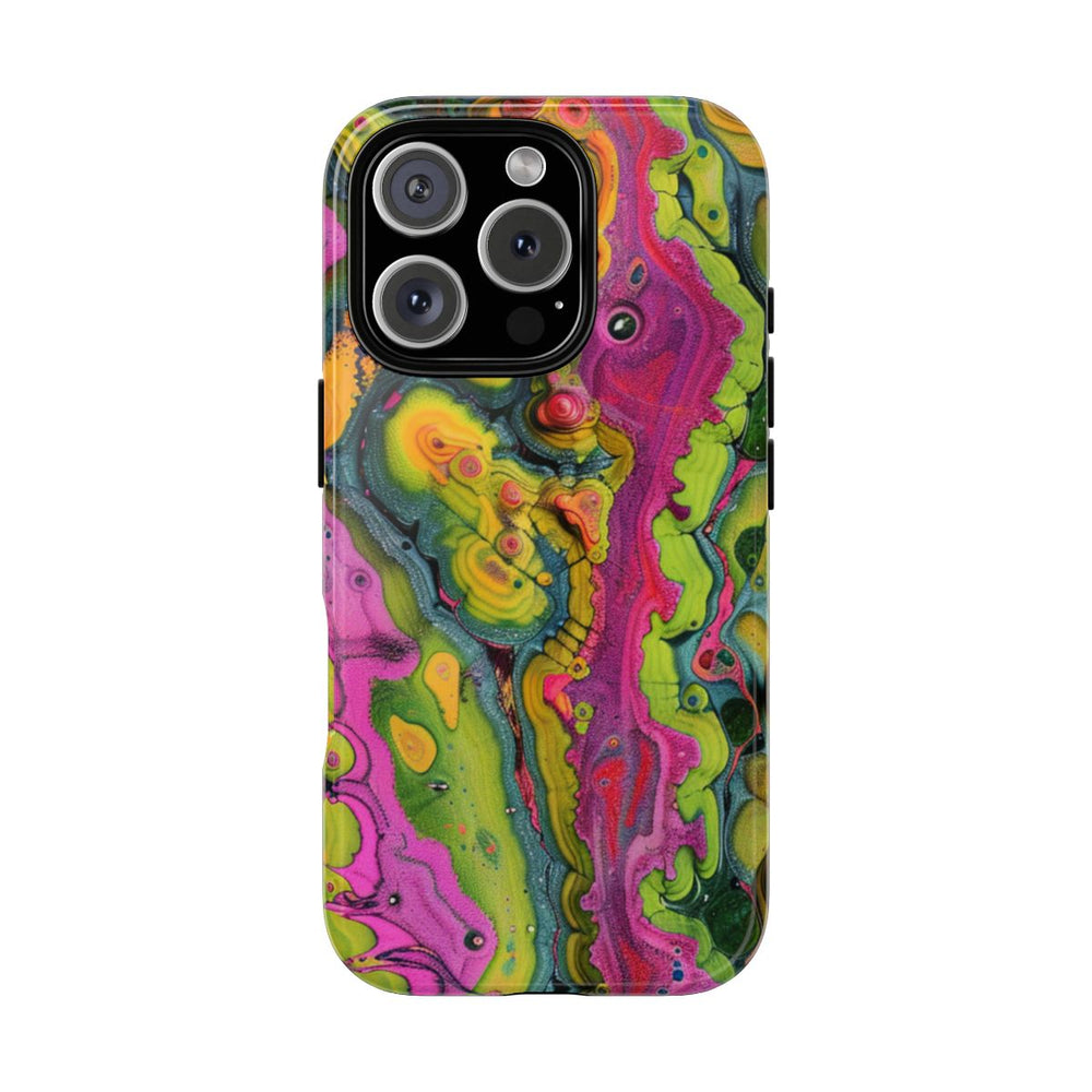 Dit hoesje heeft een opvallend ontwerp met levendige, golvende organische vormen in heldere tinten geel, roze, groen en oranje. Het patroon oogt gelaagd en heeft een voelbare structuur met kleine cirkelvormige en bubbelachtige details verspreid over het geheel. De kleuren vloeien in elkaar over en zorgen voor een dynamisch, bijna psychedelisch effect. De afbeelding is gedrukt op een glanzend, stevig hoesje met een dubbele laag van polycarbonaat en een TPU-voering. Dit biedt extra bescherming en is geschikt voor draadloos opladen.