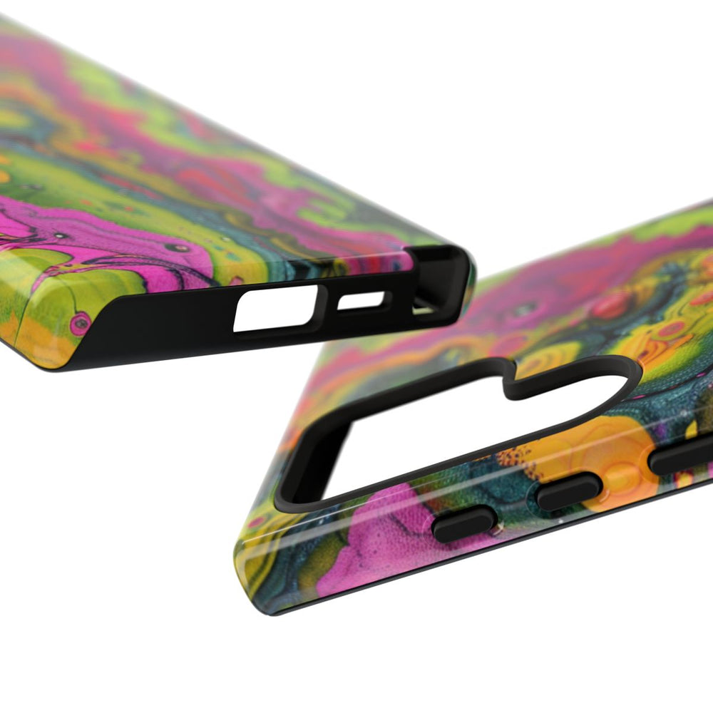 Dit hoesje heeft een opvallend ontwerp met levendige, golvende organische vormen in heldere tinten geel, roze, groen en oranje. Het patroon oogt gelaagd en heeft een voelbare structuur met kleine cirkelvormige en bubbelachtige details verspreid over het geheel. De kleuren vloeien in elkaar over en zorgen voor een dynamisch, bijna psychedelisch effect. De afbeelding is gedrukt op een glanzend, stevig hoesje met een dubbele laag van polycarbonaat en een TPU-voering. Dit biedt extra bescherming en is geschikt voor draadloos opladen.