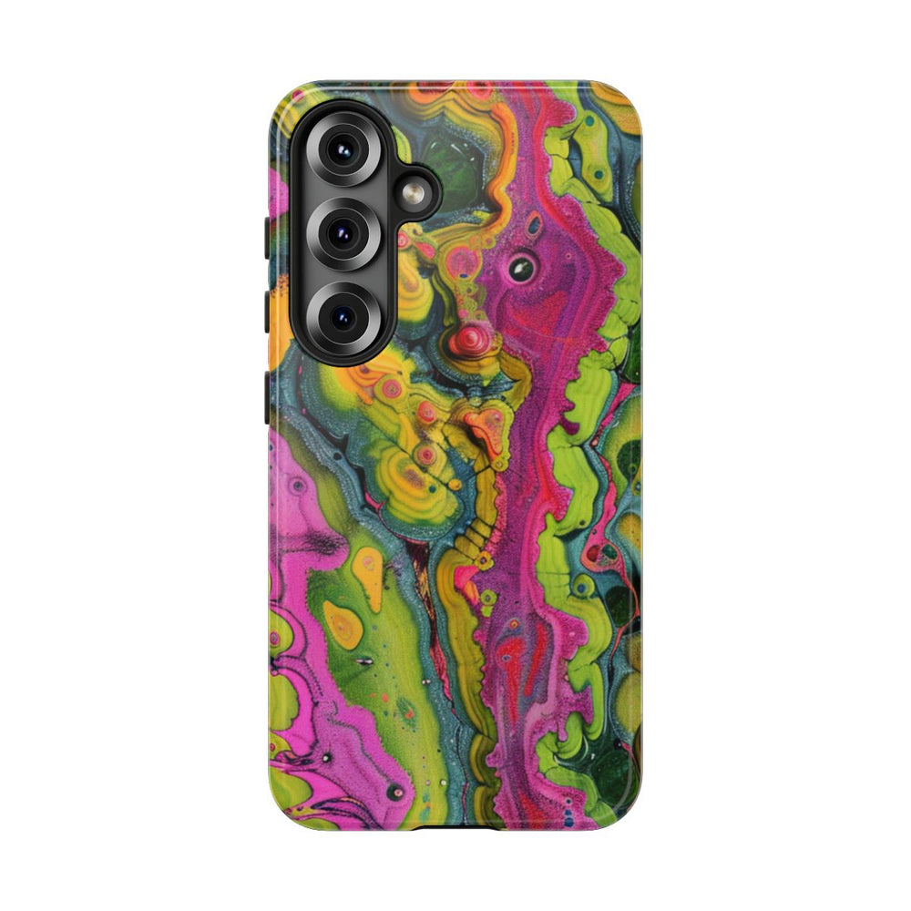 Dit hoesje heeft een opvallend ontwerp met levendige, golvende organische vormen in heldere tinten geel, roze, groen en oranje. Het patroon oogt gelaagd en heeft een voelbare structuur met kleine cirkelvormige en bubbelachtige details verspreid over het geheel. De kleuren vloeien in elkaar over en zorgen voor een dynamisch, bijna psychedelisch effect. De afbeelding is gedrukt op een glanzend, stevig hoesje met een dubbele laag van polycarbonaat en een TPU-voering. Dit biedt extra bescherming en is geschikt voor draadloos opladen.