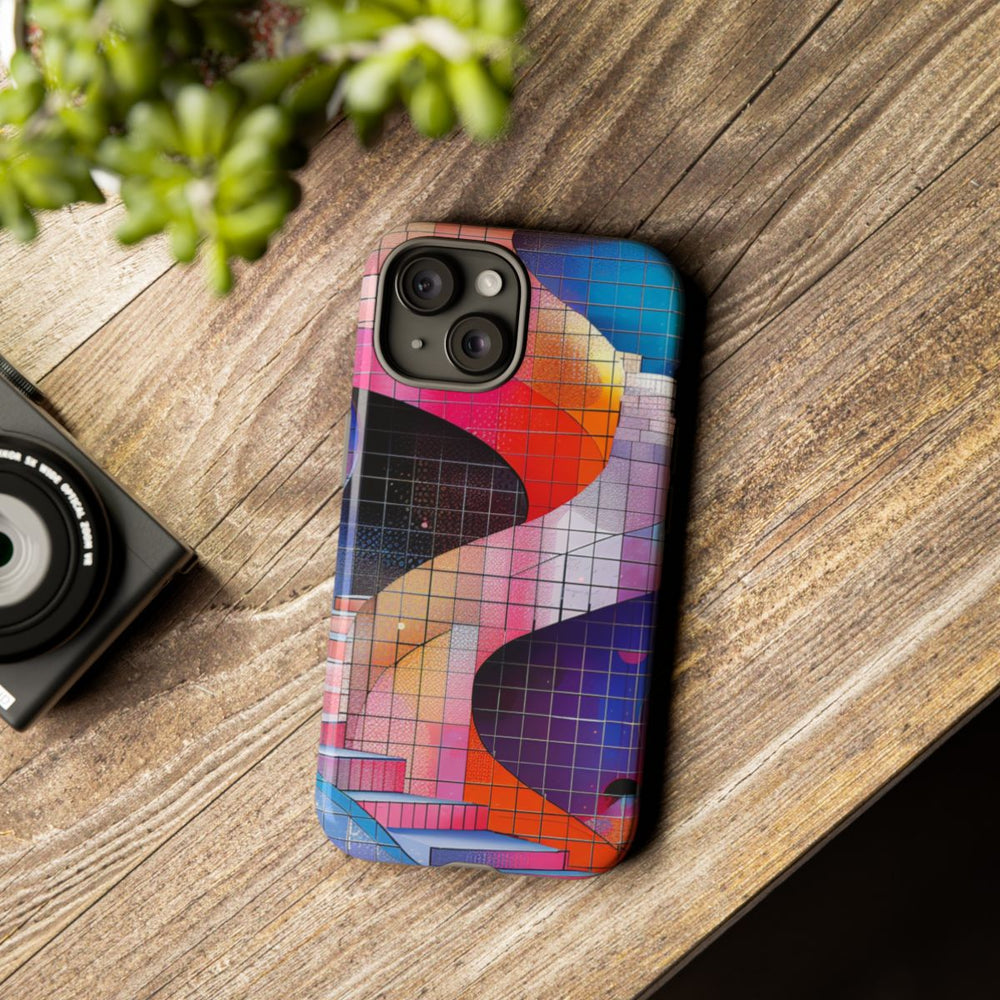Dit telefoonhoesje is voorzien van een levendig ontwerp met een kleurrijke spiraaltrap, vloeiende lijnen en een mozaïekachtig effect. De trap kronkelt omhoog tegen een dynamische achtergrond van geometrische vormen en kleurverlopen in tinten roze, rood, oranje, blauw en paars. De afbeelding heeft een glanzende afwerking en is bedrukt op een stevig hoesje van polycarbonaat en TPU. Dankzij de dubbele laag biedt het hoesje extra bescherming en is het geschikt voor draadloos opladen.