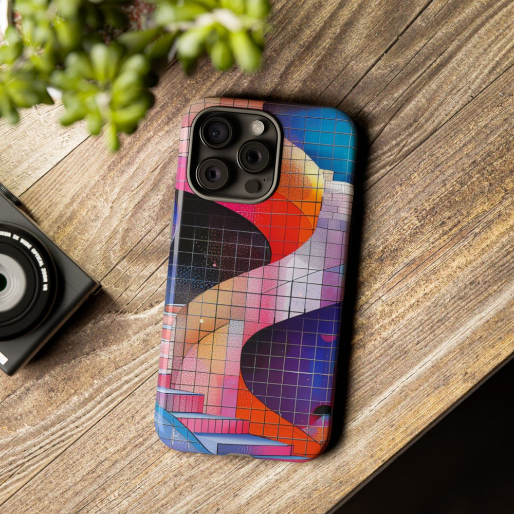 Dit telefoonhoesje is voorzien van een levendig ontwerp met een kleurrijke spiraaltrap, vloeiende lijnen en een mozaïekachtig effect. De trap kronkelt omhoog tegen een dynamische achtergrond van geometrische vormen en kleurverlopen in tinten roze, rood, oranje, blauw en paars. De afbeelding heeft een glanzende afwerking en is bedrukt op een stevig hoesje van polycarbonaat en TPU. Dankzij de dubbele laag biedt het hoesje extra bescherming en is het geschikt voor draadloos opladen.
