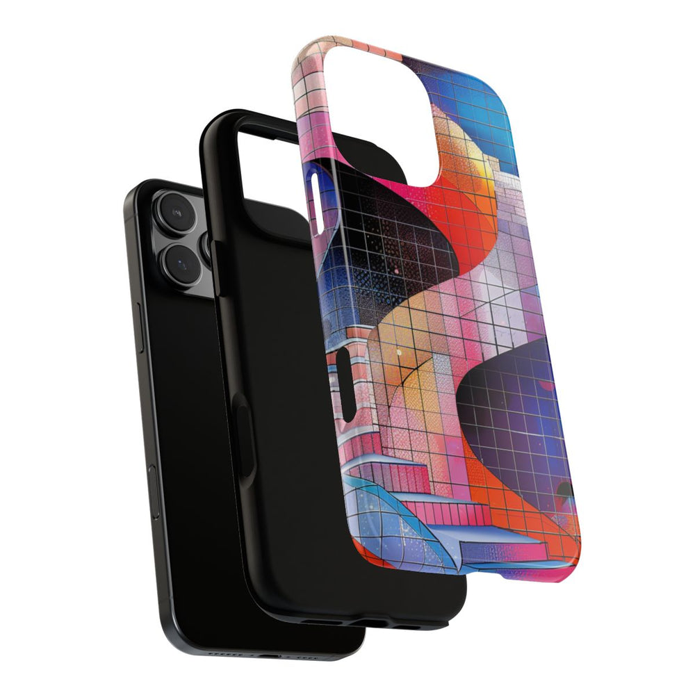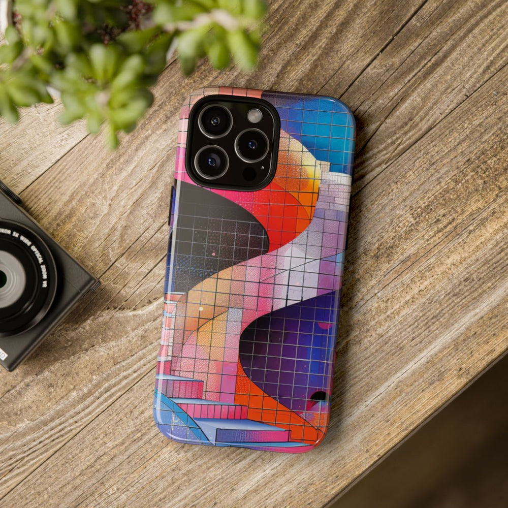 Dit telefoonhoesje is voorzien van een levendig ontwerp met een kleurrijke spiraaltrap, vloeiende lijnen en een mozaïekachtig effect. De trap kronkelt omhoog tegen een dynamische achtergrond van geometrische vormen en kleurverlopen in tinten roze, rood, oranje, blauw en paars. De afbeelding heeft een glanzende afwerking en is bedrukt op een stevig hoesje van polycarbonaat en TPU. Dankzij de dubbele laag biedt het hoesje extra bescherming en is het geschikt voor draadloos opladen.