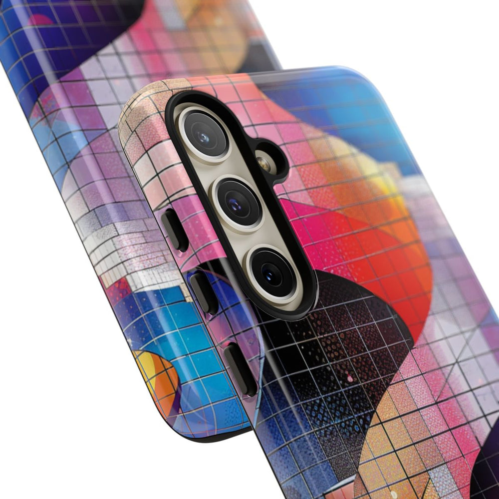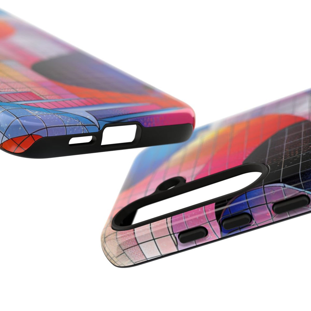 Dit telefoonhoesje is voorzien van een levendig ontwerp met een kleurrijke spiraaltrap, vloeiende lijnen en een mozaïekachtig effect. De trap kronkelt omhoog tegen een dynamische achtergrond van geometrische vormen en kleurverlopen in tinten roze, rood, oranje, blauw en paars. De afbeelding heeft een glanzende afwerking en is bedrukt op een stevig hoesje van polycarbonaat en TPU. Dankzij de dubbele laag biedt het hoesje extra bescherming en is het geschikt voor draadloos opladen.