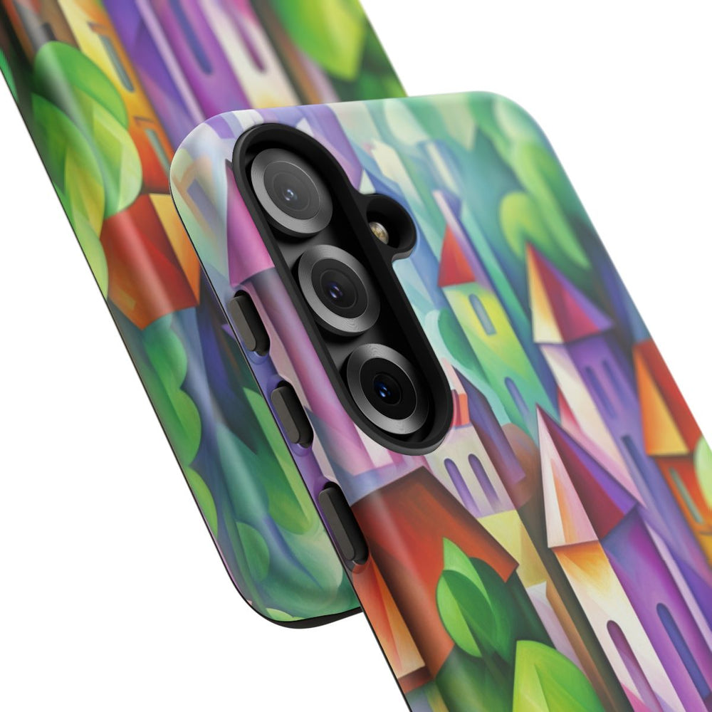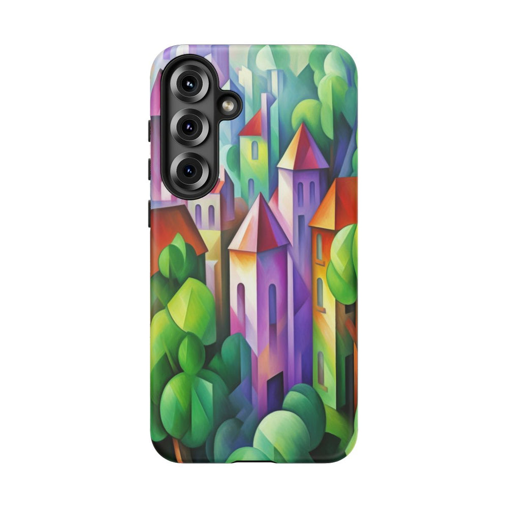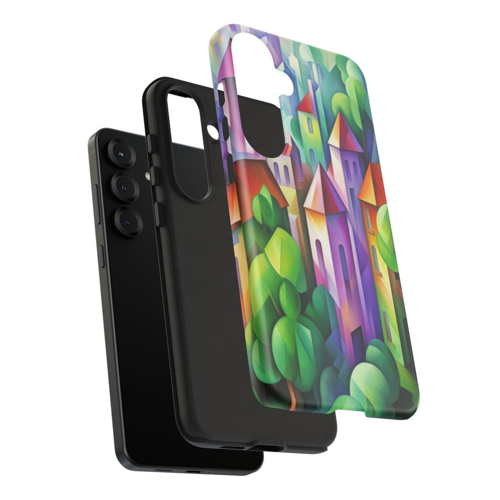 Dit ontwerp toont een levendig en kleurrijk abstract stadsgezicht met geometrische gebouwen en weelderig groene bomen. De gebouwen hebben opvallende vormen, rode daken en een mix van paarse en gele tinten. De achtergrond bestaat uit een zachte kleurovergang, wat zorgt voor een serene en toch dynamische uitstraling. Deze afbeelding is gedrukt op een mat telefoonhoesje dat stevig is, perfect past en optimale bescherming biedt voor je toestel. Het hoesje is gemaakt van duurzame materialen en ondersteunt draadloos opladen.
