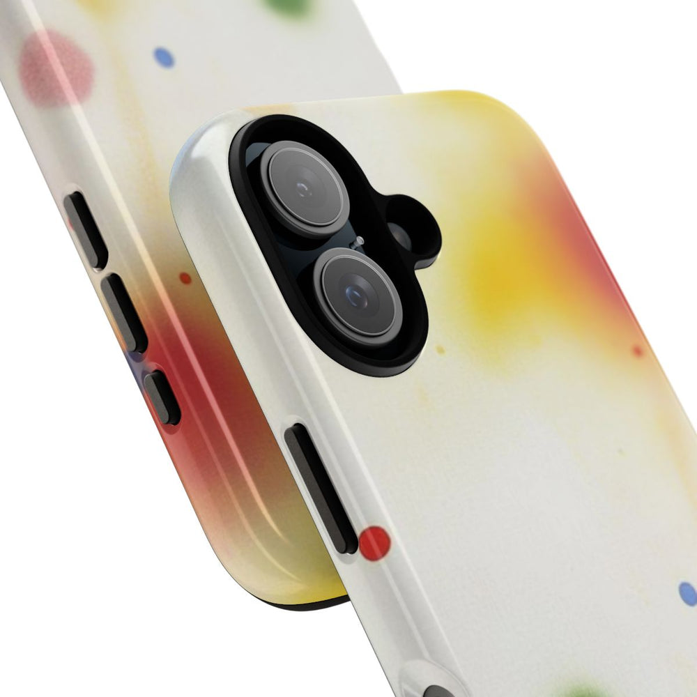 Dit hoesje heeft een abstract patroon van vervaagde stippen met zachte randen in verschillende kleuren, zoals rood, blauw, geel, groen en paars op een witte achtergrond. De stippen verschillen in grootte en intensiteit, wat zorgt voor een dromerig en speels geheel. Het hoesje is glanzend en stevig, gemaakt van een polycarbonaat buitenkant met een TPU binnenlaag, waardoor het optimale dubbele bescherming biedt. Geschikt voor draadloos opladen. Het geheel oogt licht en luchtig door het speelse kleurgebruik.