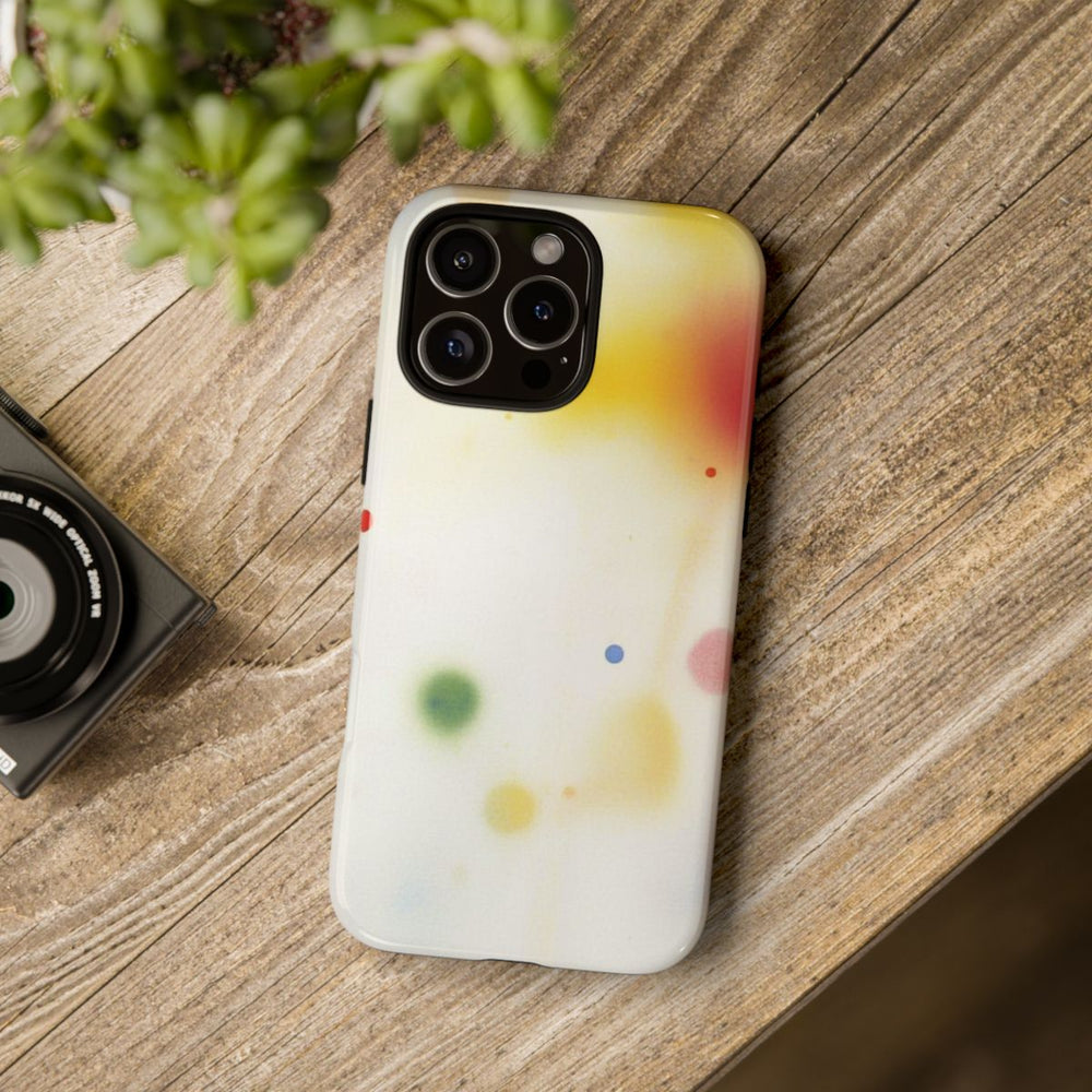 Dit hoesje heeft een abstract patroon van vervaagde stippen met zachte randen in verschillende kleuren, zoals rood, blauw, geel, groen en paars op een witte achtergrond. De stippen verschillen in grootte en intensiteit, wat zorgt voor een dromerig en speels geheel. Het hoesje is glanzend en stevig, gemaakt van een polycarbonaat buitenkant met een TPU binnenlaag, waardoor het optimale dubbele bescherming biedt. Geschikt voor draadloos opladen. Het geheel oogt licht en luchtig door het speelse kleurgebruik.