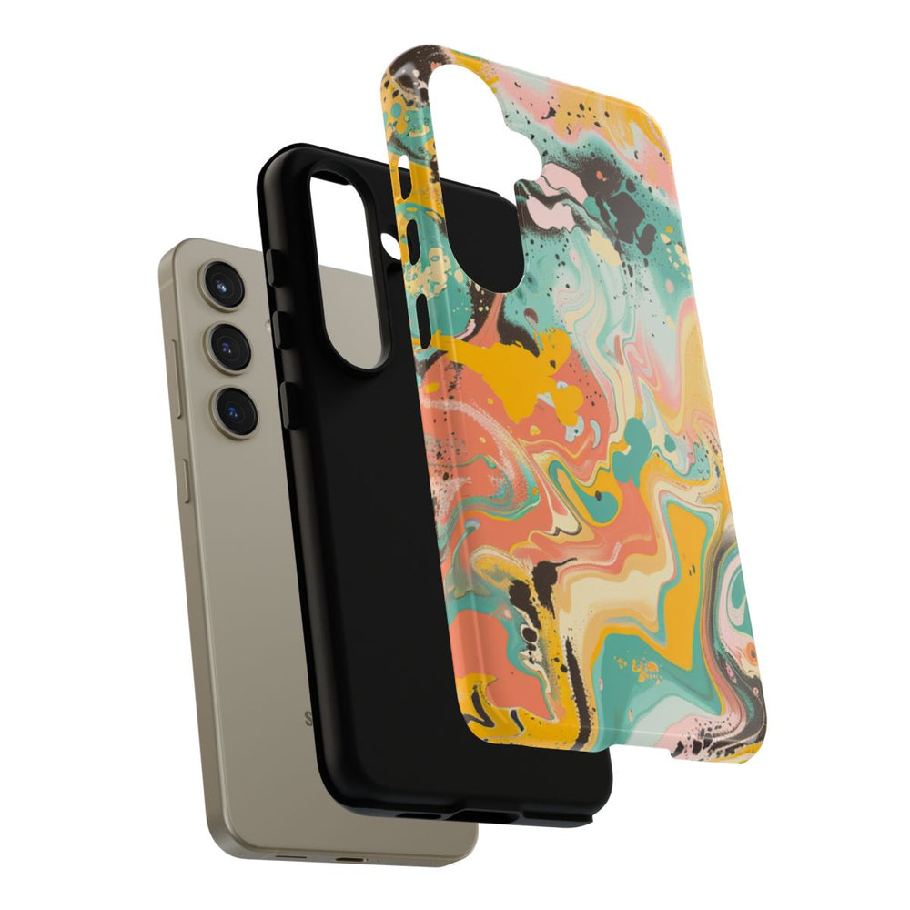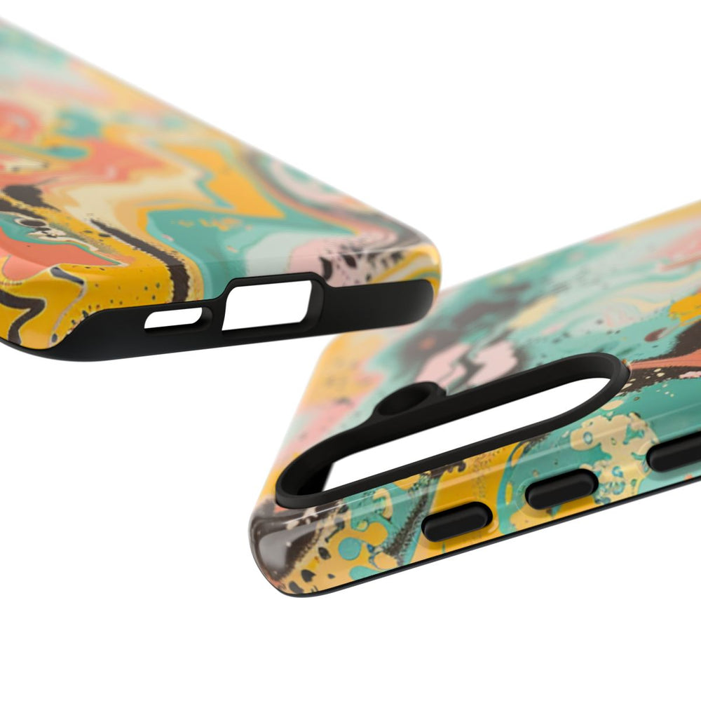 Dit hoesje heeft een levendig abstract patroon in vloeibare kunststijl, met golvende vormen en spatten van kleur. De belangrijkste kleuren zijn turquoise, koraalroze, zonnig geel, beige en zwarte accenten. Het ontwerp oogt dynamisch en vloeiend, met soepele lijnen en verspreide stipjes. Dankzij de glanzende afwerking en de stevige dubbele laag van polycarbonaat en TPU biedt dit hoesje extra stevigheid en bescherming. Geschikt voor draadloos opladen.