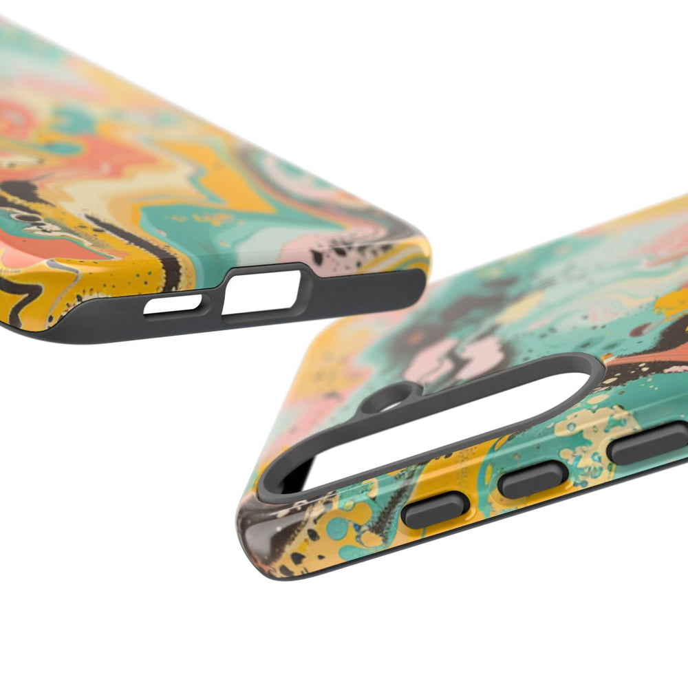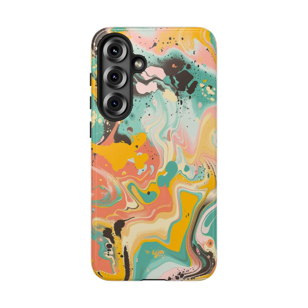 Dit hoesje heeft een levendig abstract patroon in vloeibare kunststijl, met golvende vormen en spatten van kleur. De belangrijkste kleuren zijn turquoise, koraalroze, zonnig geel, beige en zwarte accenten. Het ontwerp oogt dynamisch en vloeiend, met soepele lijnen en verspreide stipjes. Dankzij de glanzende afwerking en de stevige dubbele laag van polycarbonaat en TPU biedt dit hoesje extra stevigheid en bescherming. Geschikt voor draadloos opladen.