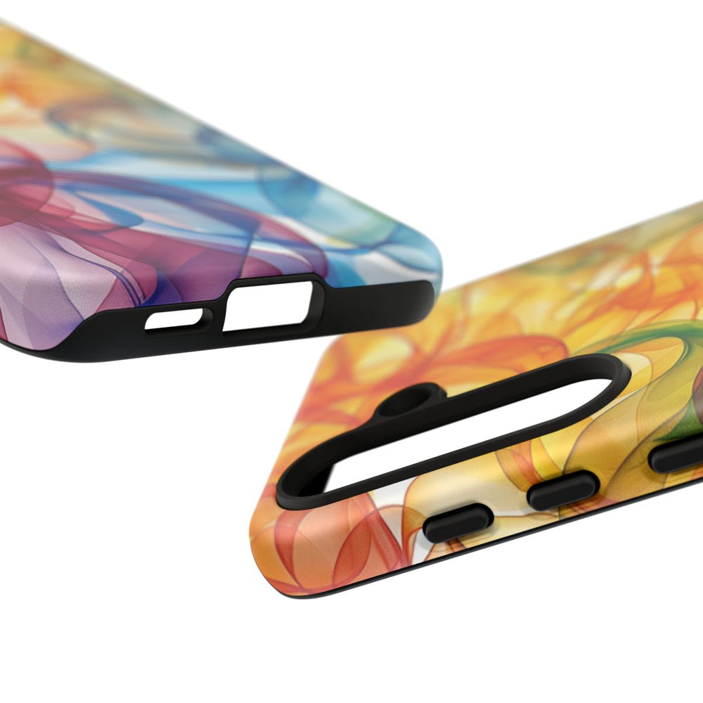 Dit hoesje heeft een opvallend ontwerp met doorschijnende, vloeiende vormen in diverse kleuren zoals rood, oranje, geel, groen en blauw. De vormen overlappen en verweven zich, waardoor er een dynamisch en abstract patroon ontstaat met veel diepte en beweging. Het hoesje heeft een matte afwerking en bestaat uit een stevige polycarbonaat buitenkant met een TPU binnenlaag. Zo biedt het hoesje optimale bescherming en is het geschikt voor draadloos opladen.