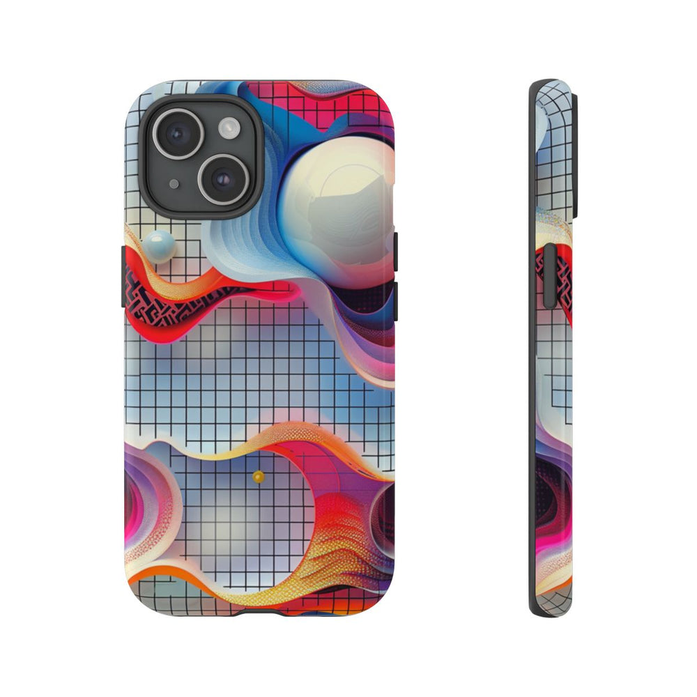 Dit telefoonhoesje heeft een opvallend abstract ontwerp met vloeiende, golvende vormen in tinten blauw, roze, oranje en paars. Glanzende, bolvormige accenten zijn verspreid over het geheel en zorgen voor diepte en een driedimensionaal effect. De achtergrond bestaat uit een rasterpatroon met zwarte lijnen op een lichte ondergrond, wat het geometrische karakter versterkt. Het hoesje is een stevige, glanzende uitvoering met dubbele laag van polycarbonaat en TPU, ontworpen voor duurzaamheid en bescherming buitenshuis. Geschikt voor draadloos opladen.