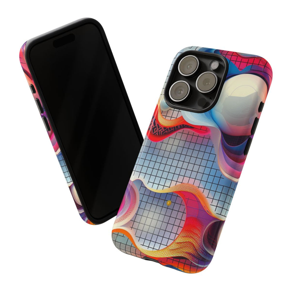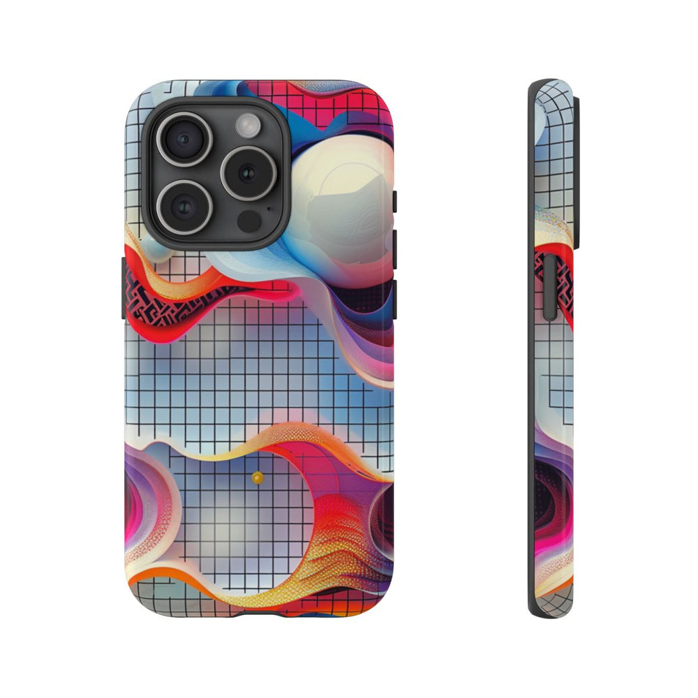 Dit telefoonhoesje heeft een opvallend abstract ontwerp met vloeiende, golvende vormen in tinten blauw, roze, oranje en paars. Glanzende, bolvormige accenten zijn verspreid over het geheel en zorgen voor diepte en een driedimensionaal effect. De achtergrond bestaat uit een rasterpatroon met zwarte lijnen op een lichte ondergrond, wat het geometrische karakter versterkt. Het hoesje is een stevige, glanzende uitvoering met dubbele laag van polycarbonaat en TPU, ontworpen voor duurzaamheid en bescherming buitenshuis. Geschikt voor draadloos opladen.