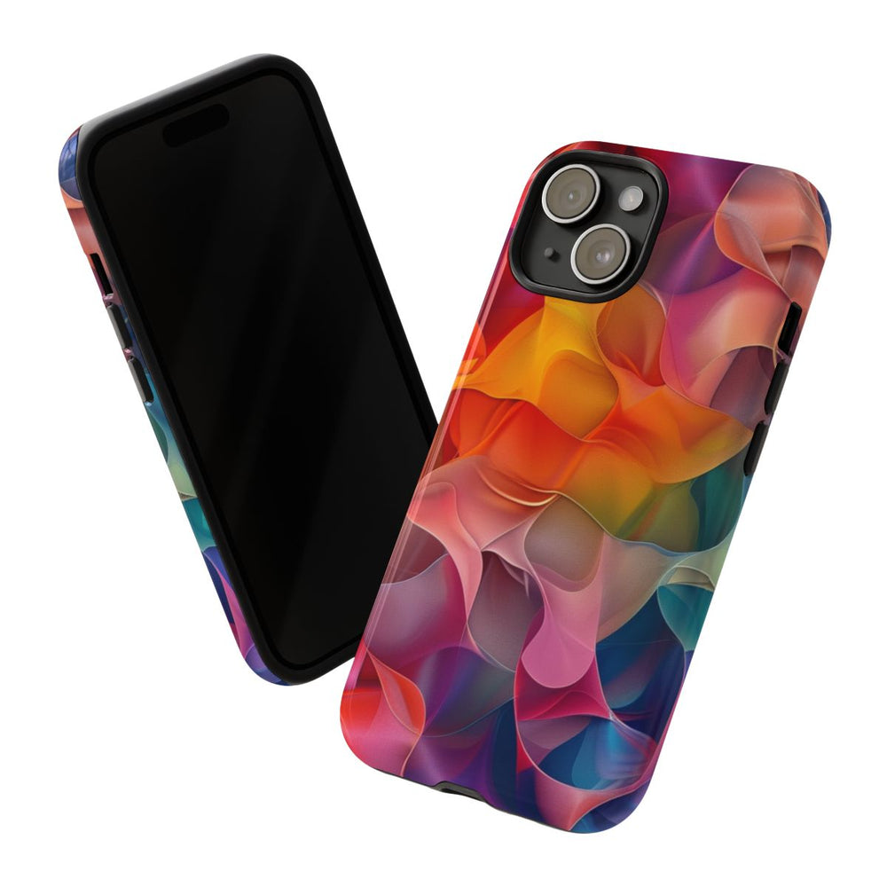 Dit hoesje is voorzien van een levendig abstract patroon met vloeiende, in elkaar overlopende vormen. De afbeelding bestaat uit een rijke mix van kleuren zoals rood, oranje, paars, blauw en teal, wat zorgt voor een dynamisch en opvallend geheel. De vormen hebben een zachte, doorschijnende uitstraling die diepte en beweging toevoegt. Het patroon is gedrukt op een glanzend, stevig hoesje van duurzaam polycarbonaat en TPU, dat extra bescherming biedt en geschikt is voor draadloos opladen.