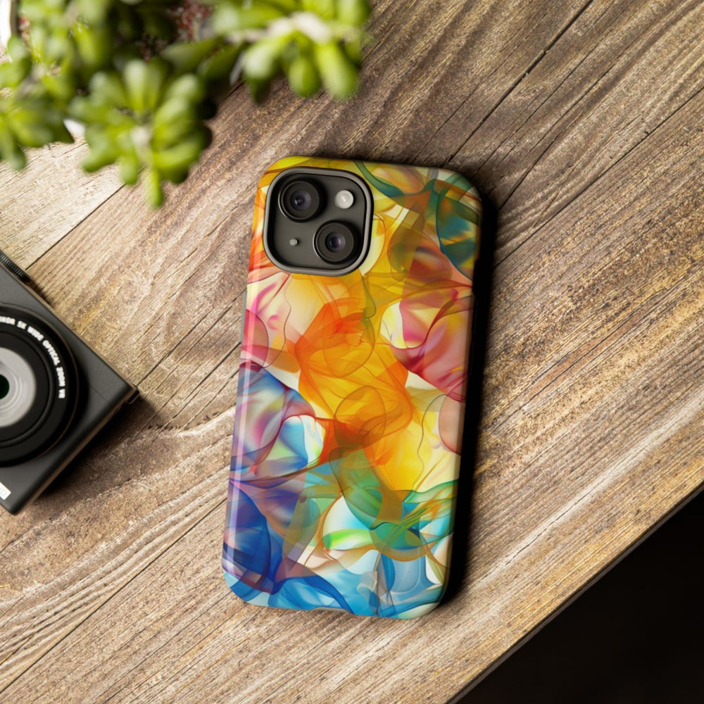 Dit ontwerp toont een abstract patroon van vloeiende, doorschijnende vormen in levendige kleuren zoals oranje, geel, groen, blauw en rood. De vormen overlappen en lopen zacht in elkaar over, wat zorgt voor een dynamisch en speels effect. Het geheel oogt helder en fris met een gladde, luchtige uitstraling. Het hoesje heeft een glanzende afwerking en is extra stevig dankzij de dubbele laag van een polycarbonaat buitenkant en een TPU binnenzijde. Dit biedt uitstekende bescherming en is geschikt voor draadloos opladen.