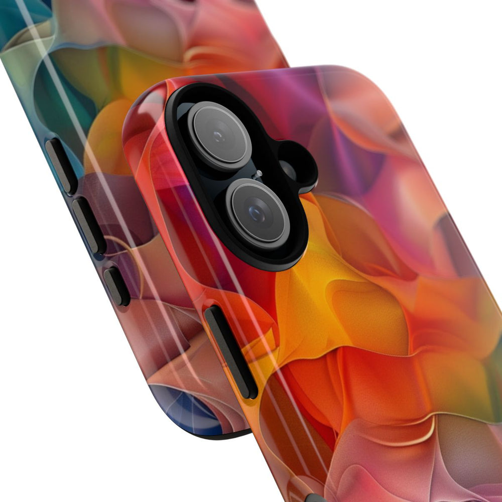 Dit hoesje is voorzien van een levendig abstract patroon met vloeiende, in elkaar overlopende vormen. De afbeelding bestaat uit een rijke mix van kleuren zoals rood, oranje, paars, blauw en teal, wat zorgt voor een dynamisch en opvallend geheel. De vormen hebben een zachte, doorschijnende uitstraling die diepte en beweging toevoegt. Het patroon is gedrukt op een glanzend, stevig hoesje van duurzaam polycarbonaat en TPU, dat extra bescherming biedt en geschikt is voor draadloos opladen.
