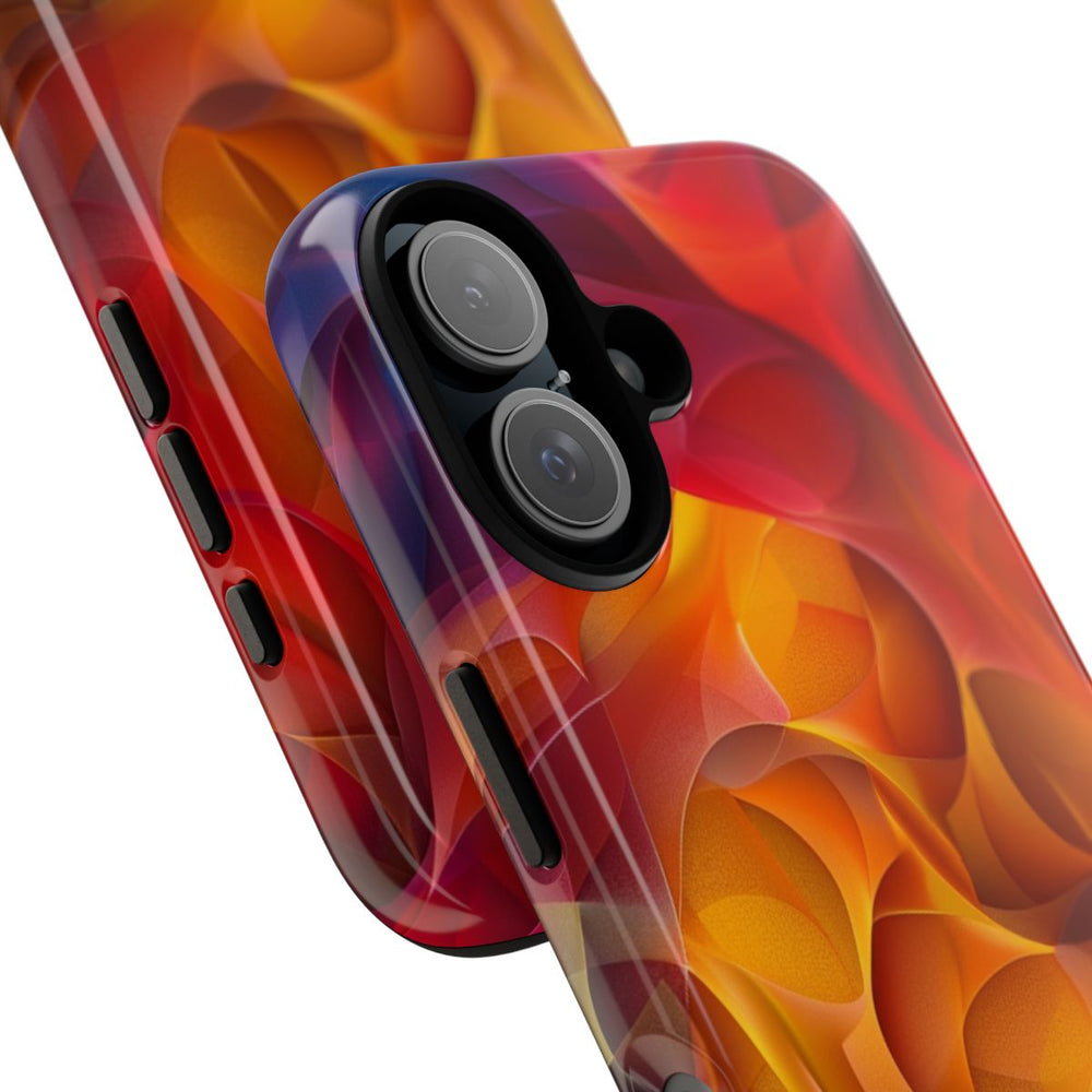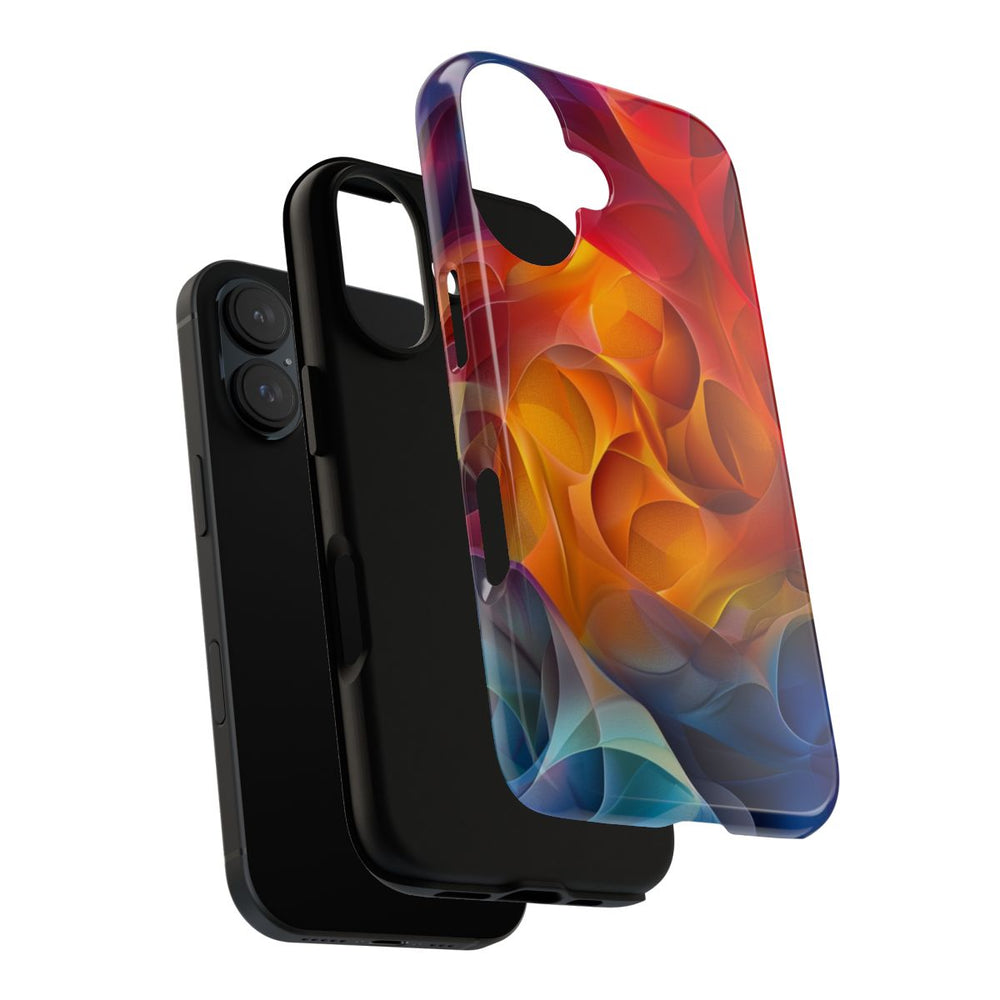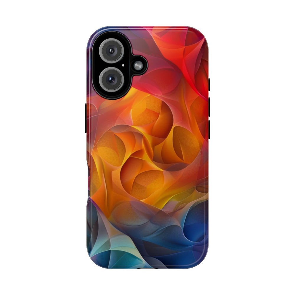 Dit telefoonhoesje heeft een abstract ontwerp van vloeiende, overlappende vormen met zachte kleurverlopen en een transparant, gelaagd effect. De kleuren lopen naadloos over van warme rood-, oranje- en geeltinten naar koelere blauwen en paarsen, wat zorgt voor een levendige en dynamische uitstraling. De afbeelding is gedrukt op een glanzend, stevig hoesje met een polycarbonaat buitenkant en een TPU binnenzijde, waardoor je toestel optimaal beschermd is. Geschikt voor draadloos opladen. Het geheel oogt modern en artistiek met een organische, vloeiende stijl.