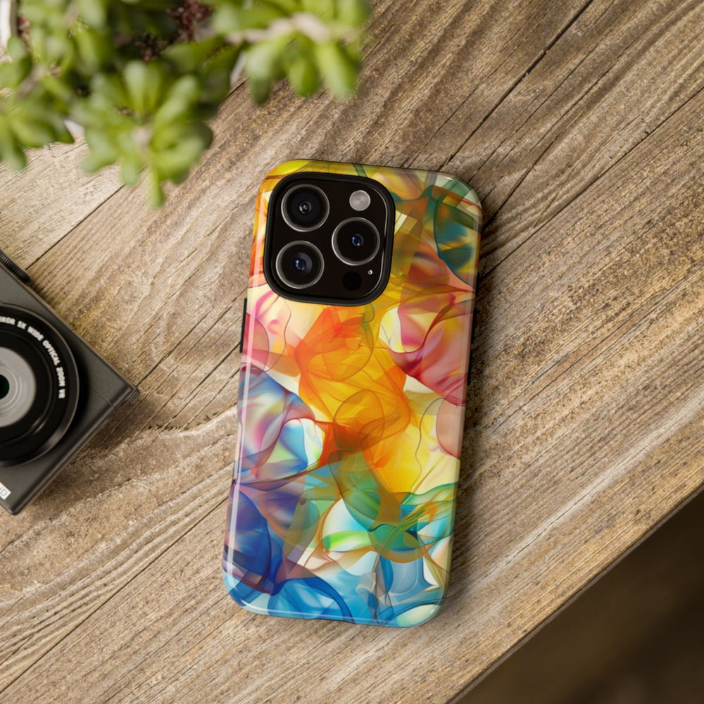 Dit ontwerp toont een abstract patroon van vloeiende, doorschijnende vormen in levendige kleuren zoals oranje, geel, groen, blauw en rood. De vormen overlappen en lopen zacht in elkaar over, wat zorgt voor een dynamisch en speels effect. Het geheel oogt helder en fris met een gladde, luchtige uitstraling. Het hoesje heeft een glanzende afwerking en is extra stevig dankzij de dubbele laag van een polycarbonaat buitenkant en een TPU binnenzijde. Dit biedt uitstekende bescherming en is geschikt voor draadloos opladen.
