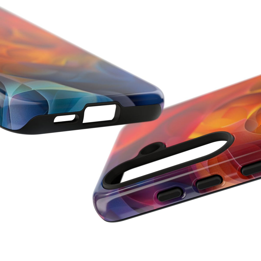 Dit telefoonhoesje heeft een abstract ontwerp van vloeiende, overlappende vormen met zachte kleurverlopen en een transparant, gelaagd effect. De kleuren lopen naadloos over van warme rood-, oranje- en geeltinten naar koelere blauwen en paarsen, wat zorgt voor een levendige en dynamische uitstraling. De afbeelding is gedrukt op een glanzend, stevig hoesje met een polycarbonaat buitenkant en een TPU binnenzijde, waardoor je toestel optimaal beschermd is. Geschikt voor draadloos opladen. Het geheel oogt modern en artistiek met een organische, vloeiende stijl.