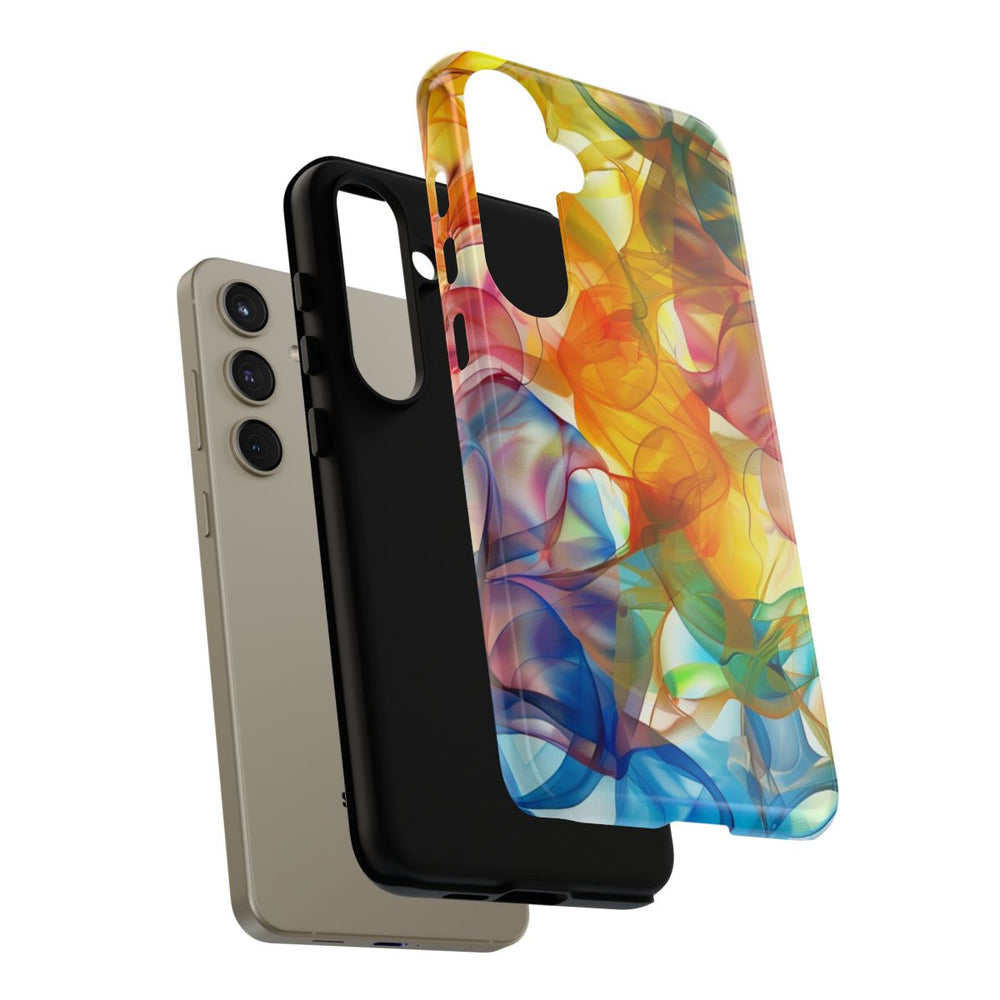 Dit ontwerp toont een abstract patroon van vloeiende, doorschijnende vormen in levendige kleuren zoals oranje, geel, groen, blauw en rood. De vormen overlappen en lopen zacht in elkaar over, wat zorgt voor een dynamisch en speels effect. Het geheel oogt helder en fris met een gladde, luchtige uitstraling. Het hoesje heeft een glanzende afwerking en is extra stevig dankzij de dubbele laag van een polycarbonaat buitenkant en een TPU binnenzijde. Dit biedt uitstekende bescherming en is geschikt voor draadloos opladen.