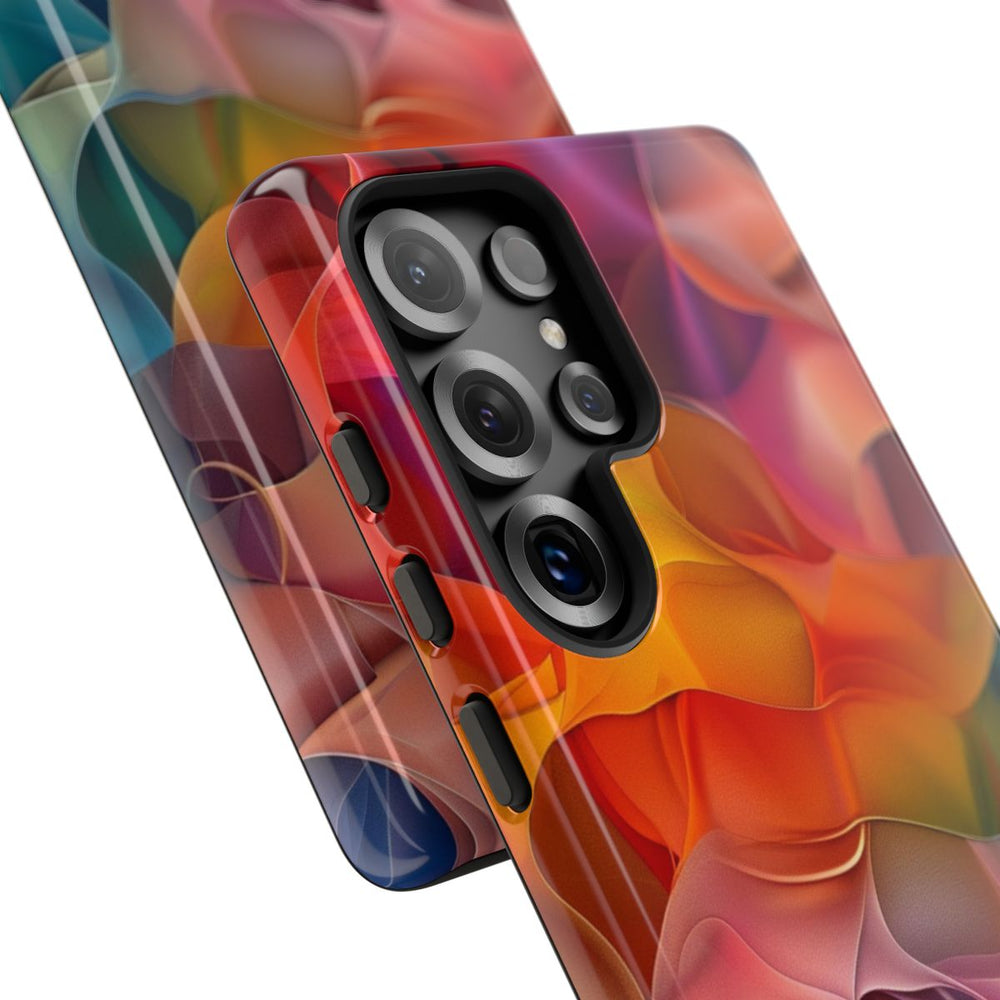 Dit hoesje is voorzien van een levendig abstract patroon met vloeiende, in elkaar overlopende vormen. De afbeelding bestaat uit een rijke mix van kleuren zoals rood, oranje, paars, blauw en teal, wat zorgt voor een dynamisch en opvallend geheel. De vormen hebben een zachte, doorschijnende uitstraling die diepte en beweging toevoegt. Het patroon is gedrukt op een glanzend, stevig hoesje van duurzaam polycarbonaat en TPU, dat extra bescherming biedt en geschikt is voor draadloos opladen.