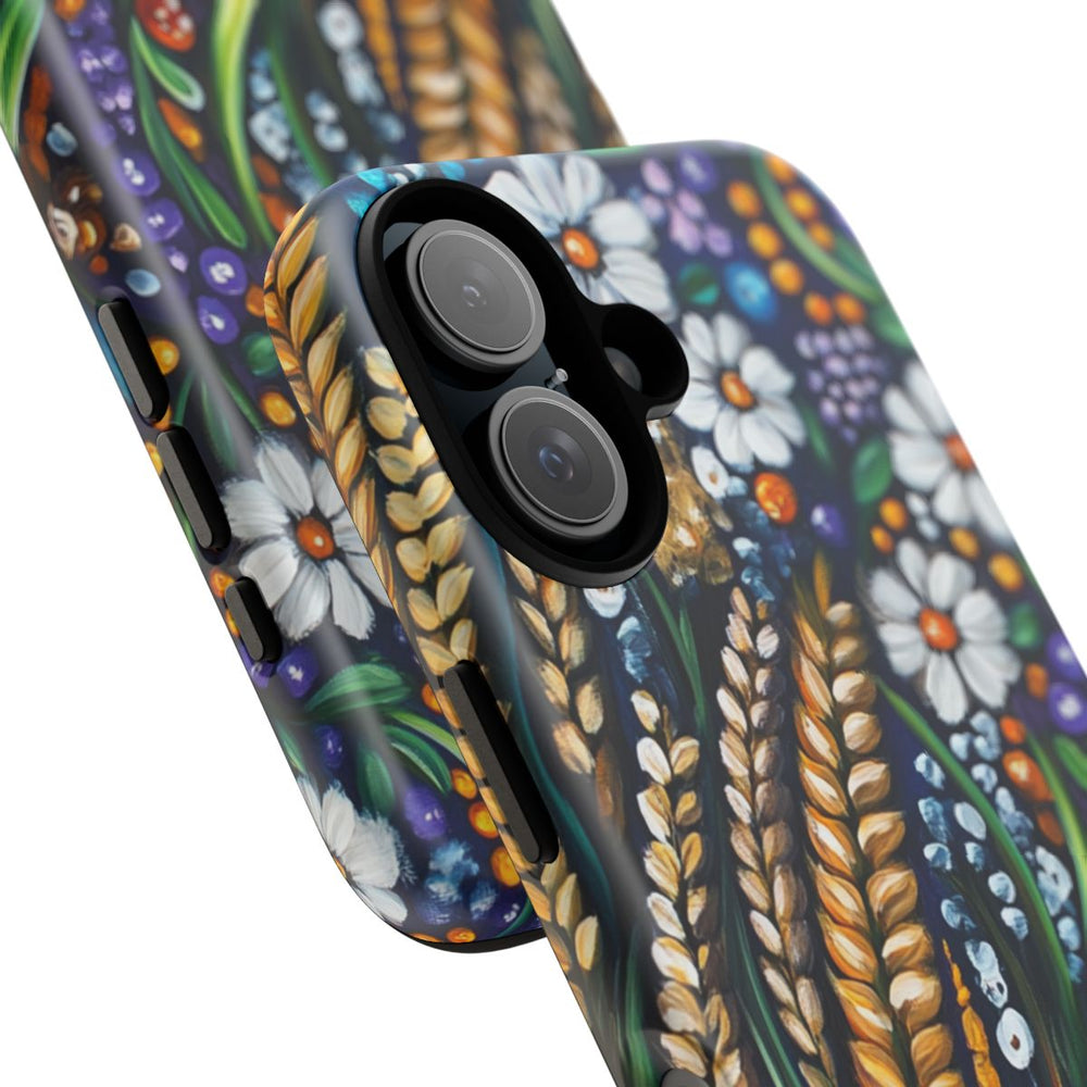 Dit ontwerp toont een levendige illustratie in folklorestijl met gouden aren en diverse kleurrijke bloemen. Je ziet onder andere witte madeliefjes met oranje harten, feloranje bloesems en trosjes kleine paarse en blauwe bloemen. Groene bladeren en stengels slingeren door het geheel, op een donkerblauwe achtergrond. Het hoesje heeft een dubbele laag van polycarbonaat en TPU met een matte afwerking, is geschikt voor draadloos opladen en biedt uitstekende bescherming tegen stoten en krassen.