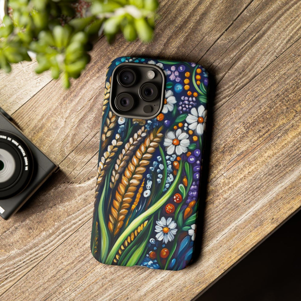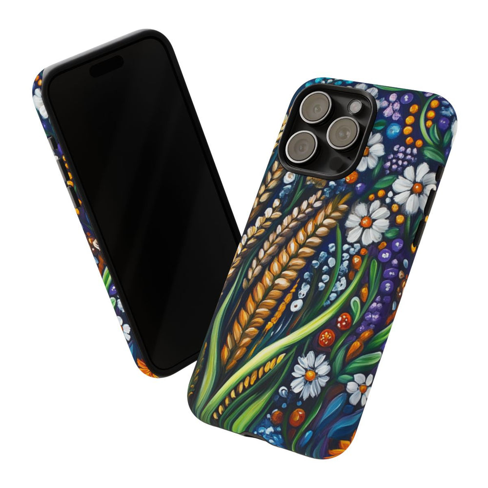 Dit hoesje heeft een levendig ontwerp in folklorestijl, met aan de linkerzijde gouden tarwehalmen en aan de rechterzijde een variatie aan kleurrijke bloemen. Je vindt er onder andere witte madeliefjes met oranje harten, feloranje bloemen en groepjes kleine blauwe en paarse bloemetjes. Groene bladeren en stelen slingeren door het geheel op een donkerblauwe achtergrond. Het telefoonhoesje bestaat uit twee lagen: een stevige polycarbonaat buitenkant en een TPU binnenzijde. Ondersteunt draadloos opladen.