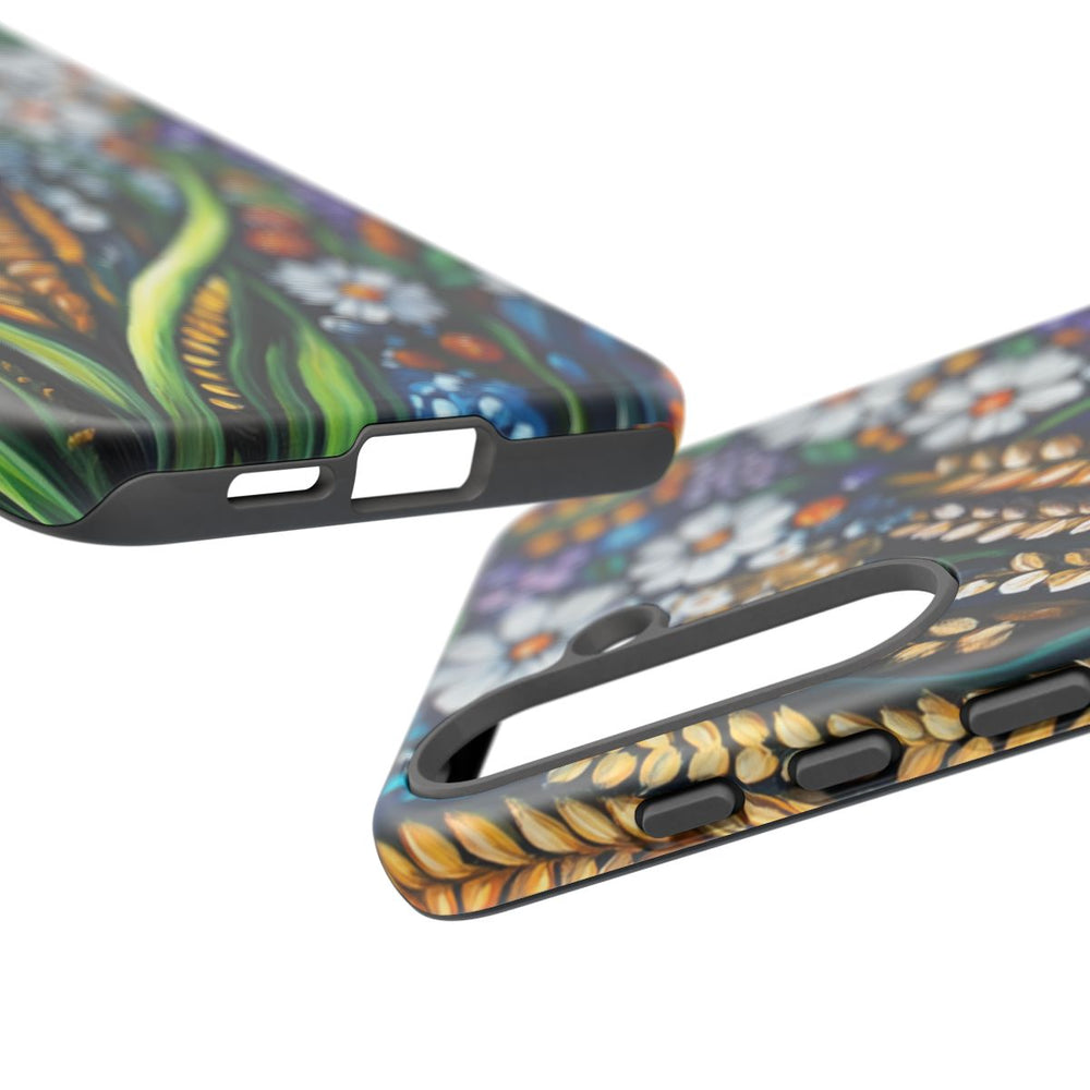 Dit hoesje heeft een opvallend ontwerp in folklorestijl, met aan de linkerkant gouden tarwehalmen en aan de rechterkant een verscheidenheid aan kleurrijke bloemen. Witte madeliefjes met oranje harten, feloranje bloemen en groepjes kleine paarse, blauwe en witte bloesems zorgen voor een levendig geheel. Groene bladeren en stengels slingeren door het ontwerp op een diepblauwe achtergrond. Het hoesje is dubbel gelaagd met een stevige polycarbonaat buitenkant en een TPU binnenzijde, en ondersteunt draadloos opladen.