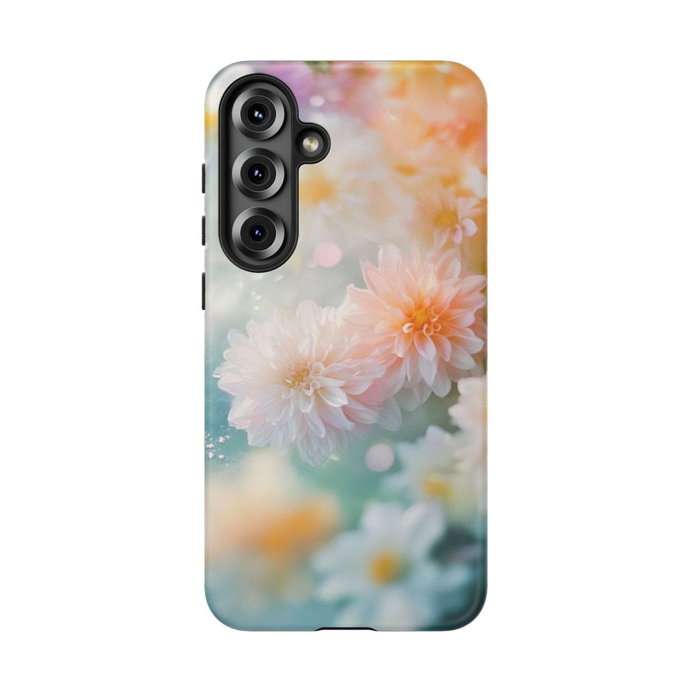 Dit hoesje is versierd met een prachtige tros kleurrijke bloemen, waarbij vooral dahlia’s in zachte pasteltinten opvallen. De afbeelding heeft een dromerige, vervaagde achtergrond met witte, gele en paarse bloemen, wat zorgt voor een rustige en levendige uitstraling. Het natuurlijke licht benadrukt de tere bloemblaadjes en geeft een zachte bokeh-effect. Het hoesje is gemaakt van stevige materialen en biedt optimale bescherming voor je toestel, terwijl het dit schitterende bloemenontwerp laat zien.