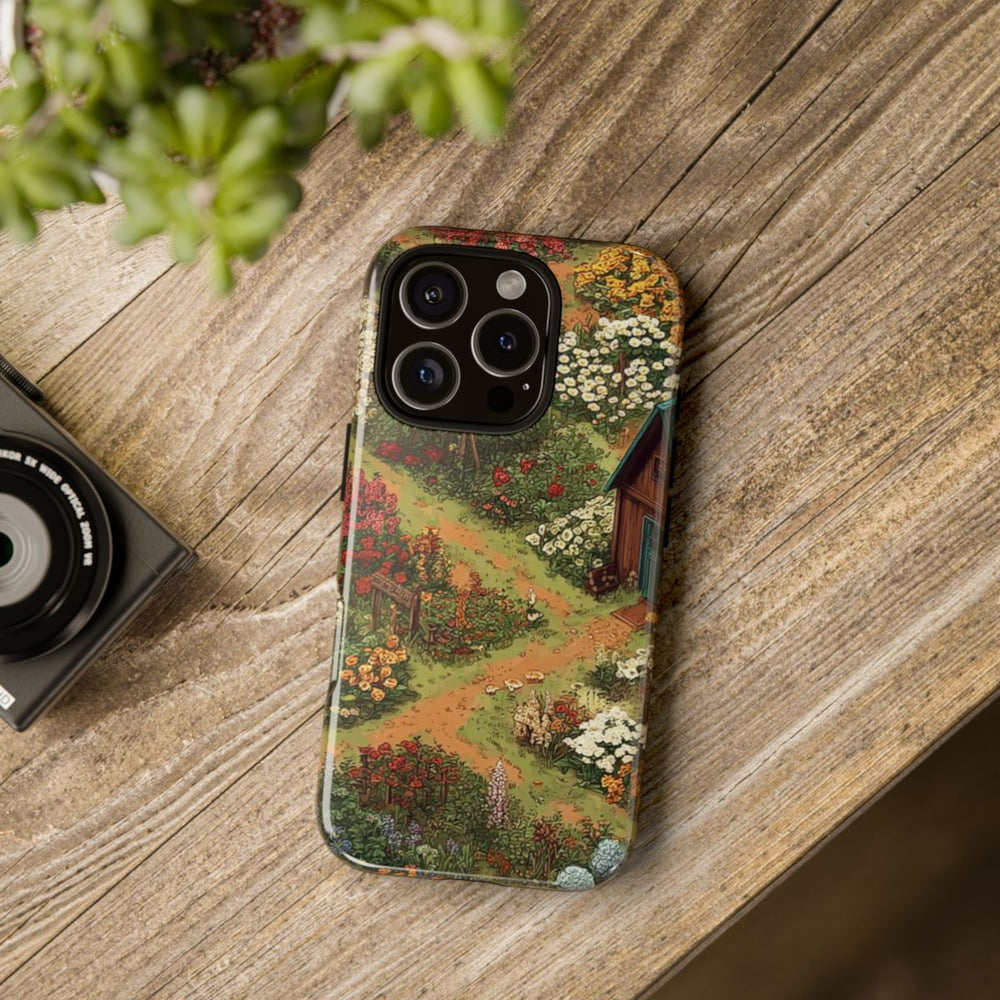 Dit hoesje toont een levendige tuinscène vol kleurrijke bloemen in volle bloei. Tussen het groen en de sinaasappelbomen staat een klein houten huisje met een blauwgroen dak. Zandpaden lopen door de tuin en zorgen voor een rustige, overzichtelijke indeling. Het ontwerp is rijk gedetailleerd en prachtig van kleur, waardoor de schoonheid van de natuur in een serene buitenomgeving goed tot uiting komt. Het hoesje heeft een glanzende afwerking, bestaat uit twee lagen voor extra bescherming en ondersteunt draadloos opladen.