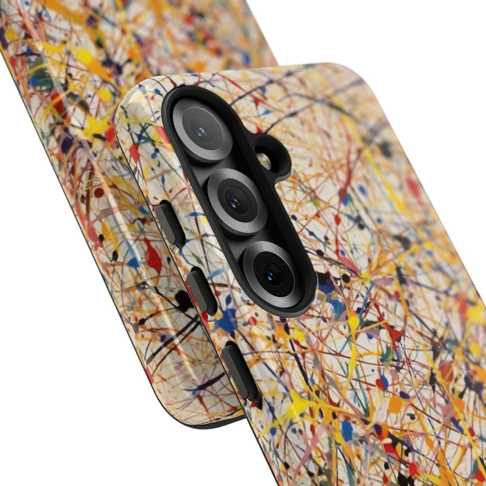 Dit hoesje heeft een opvallend abstract patroon met chaotische lijnen en spetters in diverse kleuren zoals geel, rood, blauw, zwart en oranje op een witte achtergrond. De energieke compositie zorgt voor een dynamisch en levendig effect. Het hoesje is glanzend afgewerkt en bestaat uit een dubbele laag met een polycarbonaat buitenkant en een TPU-binnenzijde, wat zorgt voor extra stevigheid en bescherming. Geschikt voor draadloos opladen en bestand tegen weersinvloeden, terwijl de optische kwaliteit behouden blijft.