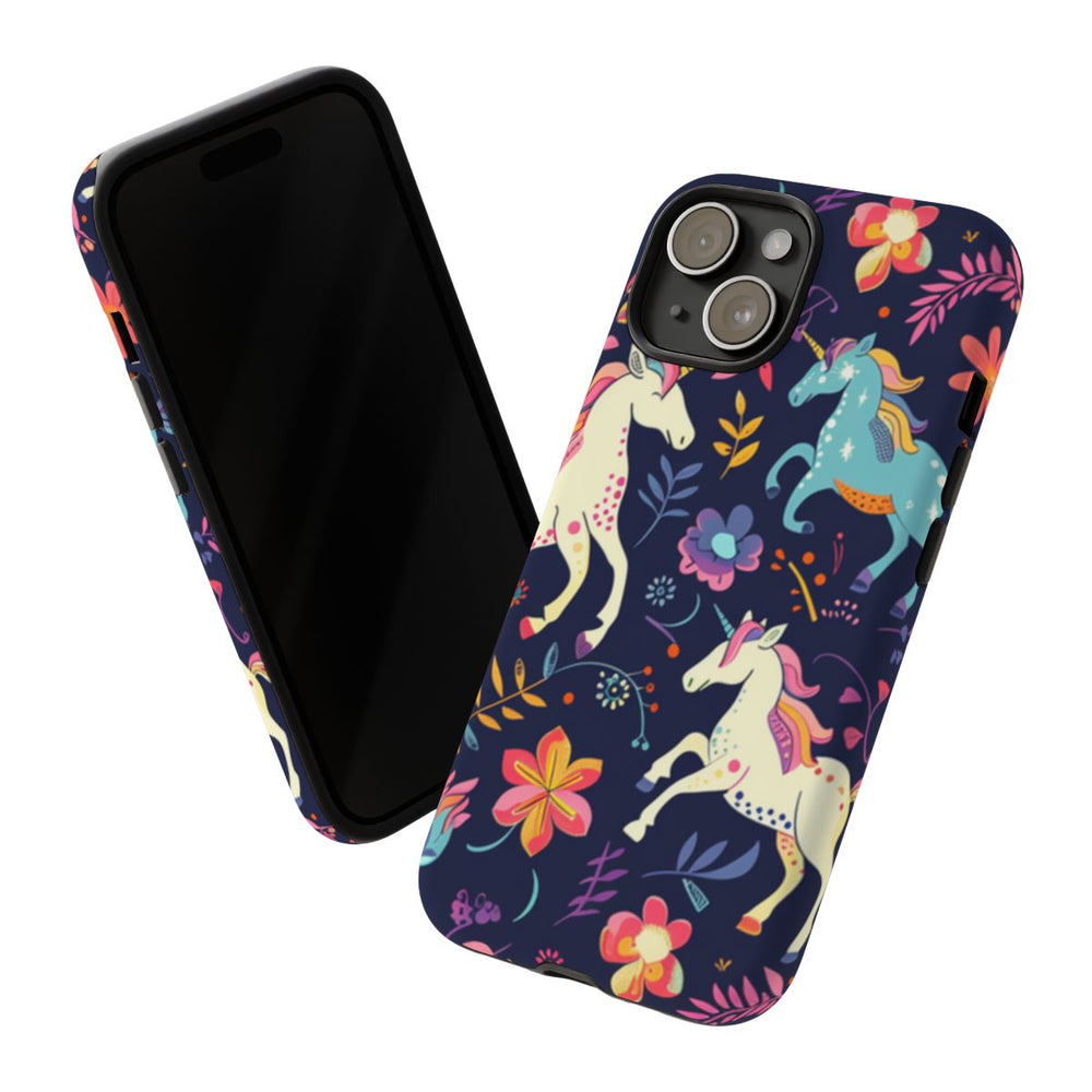 Dit telefoonhoesje is versierd met een herhalend patroon van speelse eenhoorns in pasteltinten zoals crème, blauw en roze, omringd door gestileerde bloemen en bladeren. De diepblauwe achtergrond laat de heldere kleuren van de eenhoorns en de bloemen extra opvallen. De eenhoorns zijn voorzien van decoratieve vlekken en sierlijke manen en staarten in roze, oranje en paars. Het hoesje heeft een dubbele laag, is mat afgewerkt en gemaakt van polycarbonaat en TPU. Het biedt uitstekende bescherming en ondersteunt draadloos opladen.
