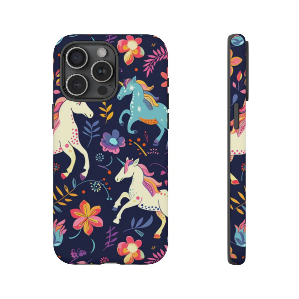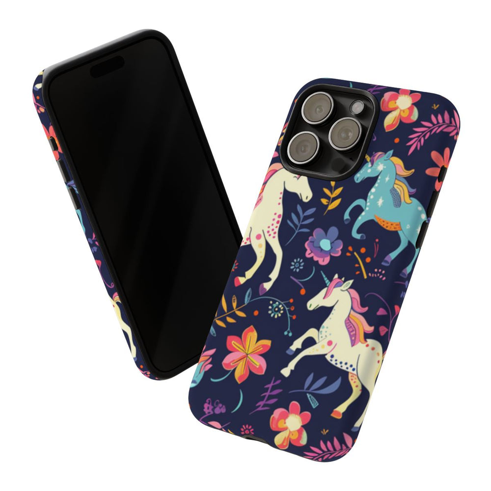 Dit telefoonhoesje is versierd met een herhalend patroon van speelse eenhoorns in pasteltinten zoals crème, blauw en roze, omringd door gestileerde bloemen en bladeren. De diepblauwe achtergrond laat de heldere kleuren van de eenhoorns en de bloemen extra opvallen. De eenhoorns zijn voorzien van decoratieve vlekken en sierlijke manen en staarten in roze, oranje en paars. Het hoesje heeft een dubbele laag, is mat afgewerkt en gemaakt van polycarbonaat en TPU. Het biedt uitstekende bescherming en ondersteunt draadloos opladen.