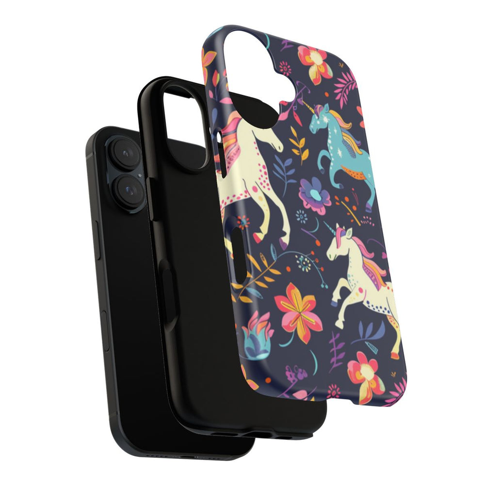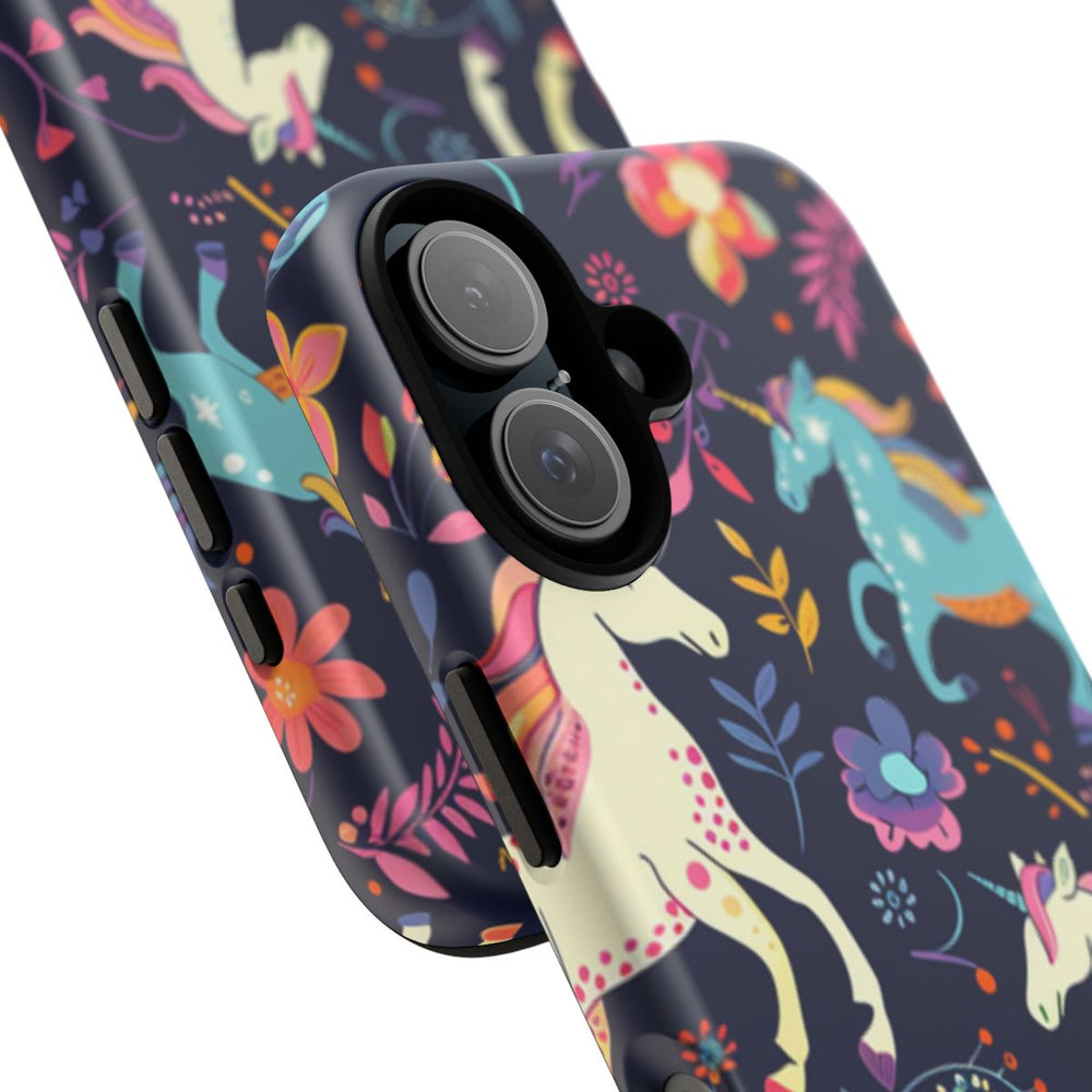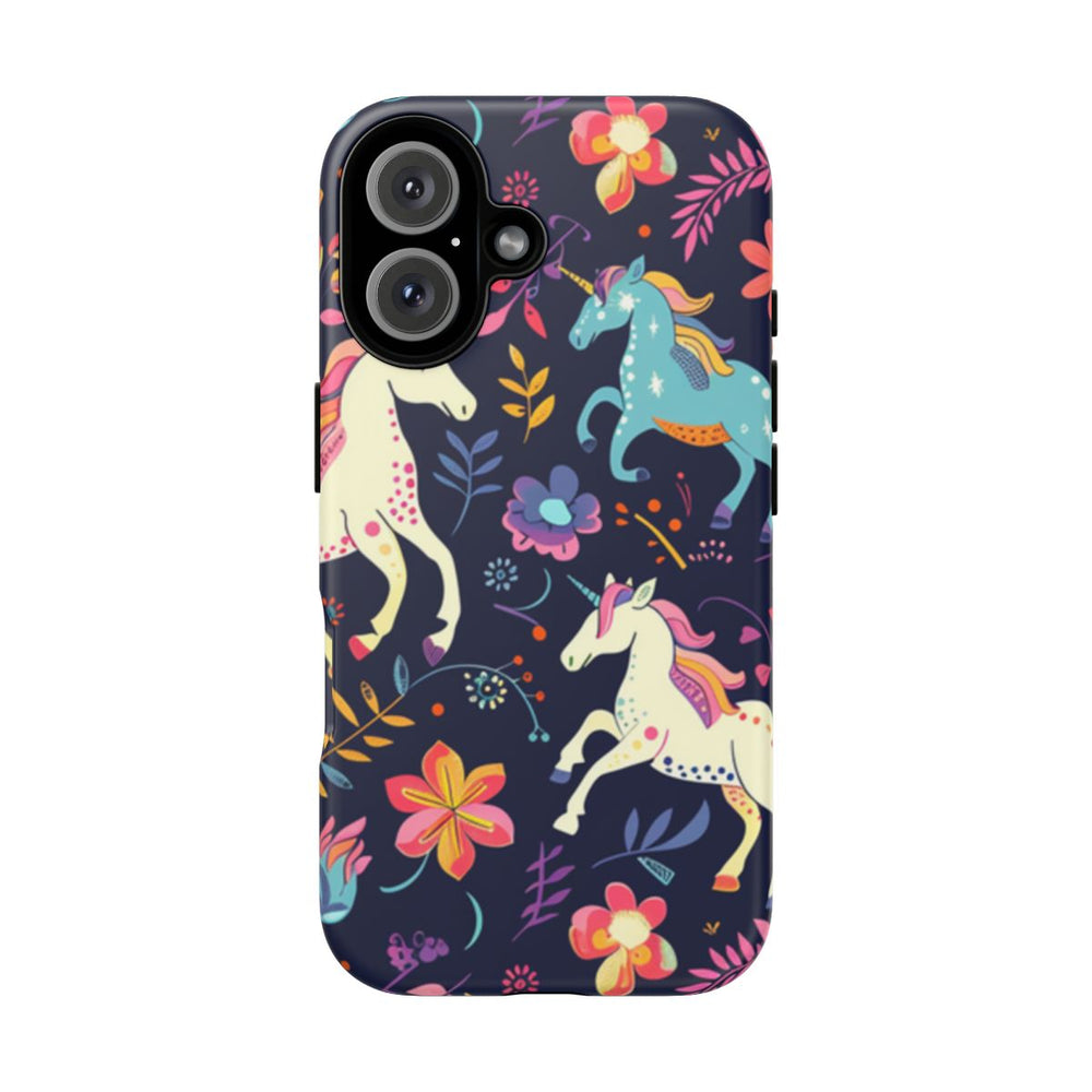 Dit telefoonhoesje is versierd met een herhalend patroon van speelse eenhoorns in pasteltinten zoals crème, blauw en roze, omringd door gestileerde bloemen en bladeren. De diepblauwe achtergrond laat de heldere kleuren van de eenhoorns en de bloemen extra opvallen. De eenhoorns zijn voorzien van decoratieve vlekken en sierlijke manen en staarten in roze, oranje en paars. Het hoesje heeft een dubbele laag, is mat afgewerkt en gemaakt van polycarbonaat en TPU. Het biedt uitstekende bescherming en ondersteunt draadloos opladen.
