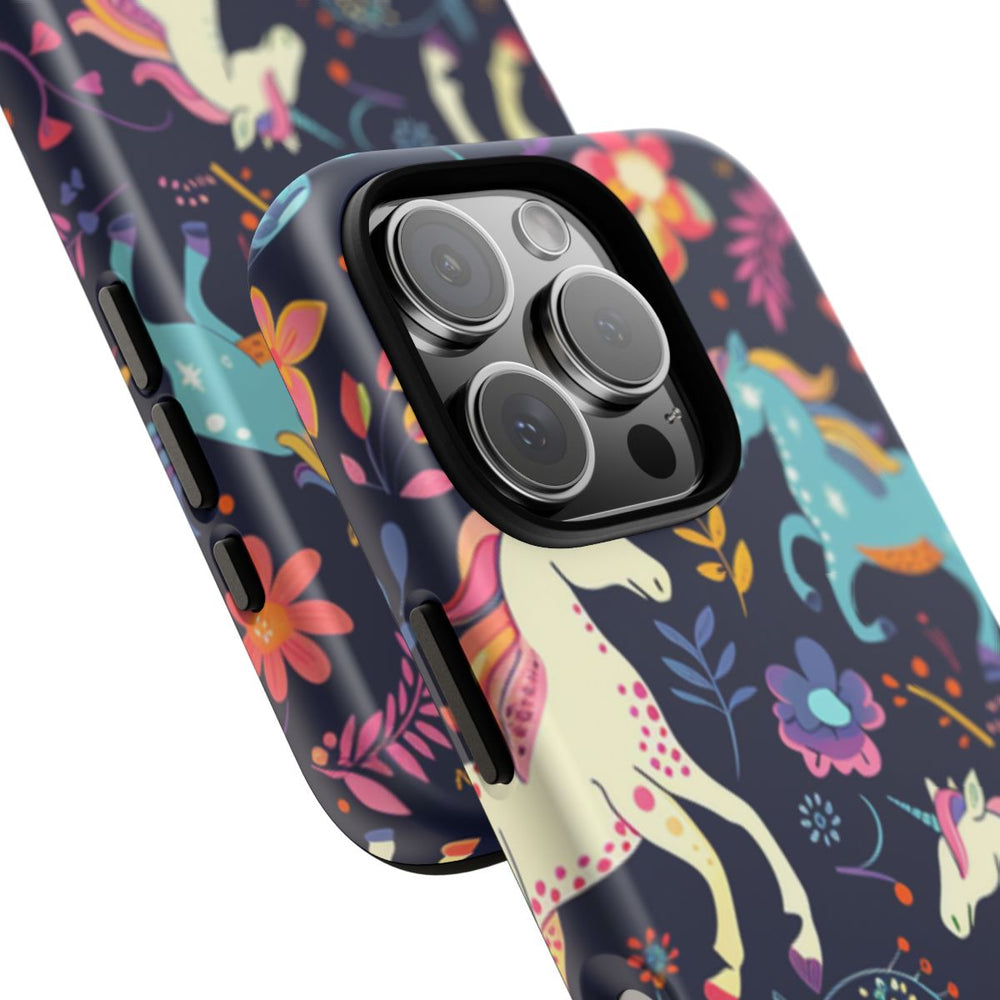 Dit telefoonhoesje is versierd met een herhalend patroon van speelse eenhoorns in pasteltinten zoals crème, blauw en roze, omringd door gestileerde bloemen en bladeren. De diepblauwe achtergrond laat de heldere kleuren van de eenhoorns en de bloemen extra opvallen. De eenhoorns zijn voorzien van decoratieve vlekken en sierlijke manen en staarten in roze, oranje en paars. Het hoesje heeft een dubbele laag, is mat afgewerkt en gemaakt van polycarbonaat en TPU. Het biedt uitstekende bescherming en ondersteunt draadloos opladen.