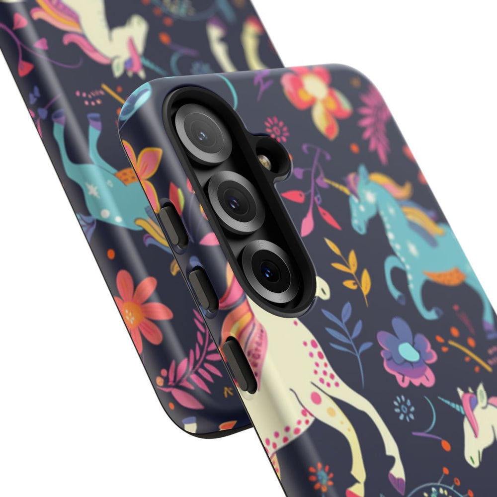 Dit telefoonhoesje is versierd met een herhalend patroon van speelse eenhoorns in pasteltinten zoals crème, blauw en roze, omringd door gestileerde bloemen en bladeren. De diepblauwe achtergrond laat de heldere kleuren van de eenhoorns en de bloemen extra opvallen. De eenhoorns zijn voorzien van decoratieve vlekken en sierlijke manen en staarten in roze, oranje en paars. Het hoesje heeft een dubbele laag, is mat afgewerkt en gemaakt van polycarbonaat en TPU. Het biedt uitstekende bescherming en ondersteunt draadloos opladen.