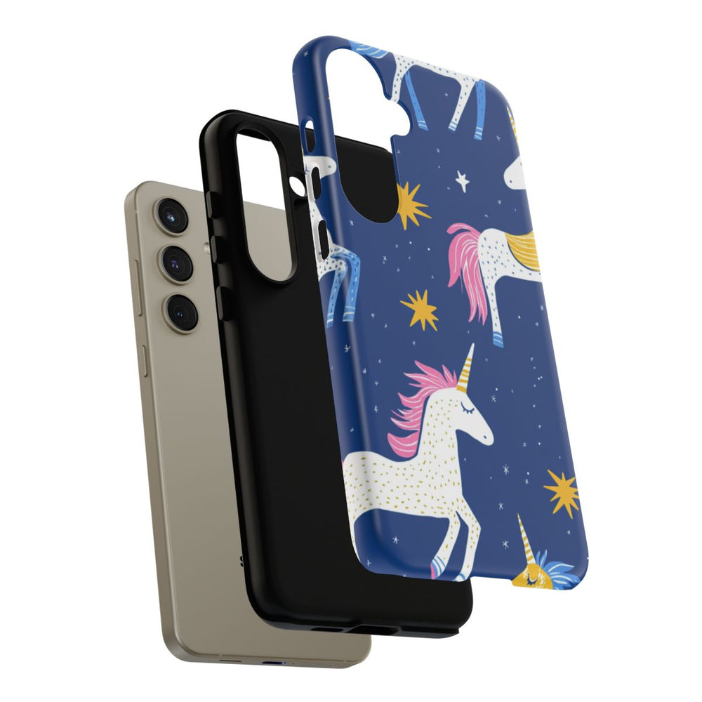 Dit telefoonhoesje heeft een vrolijk patroon van eenhoorns in verschillende kleuren, zoals wit, geel en blauw, met roze en blauwe manen en staarten. De eenhoorns hebben gouden hoorns en worden omringd door gele sterren en kleine witte stipjes op een diepblauwe achtergrond. Het ontwerp is speels en fantasierijk, uitgevoerd in een blokdrukstijl met heldere, contrasterende kleuren. Het stevige hoesje bestaat uit twee lagen en ondersteunt draadloos opladen.