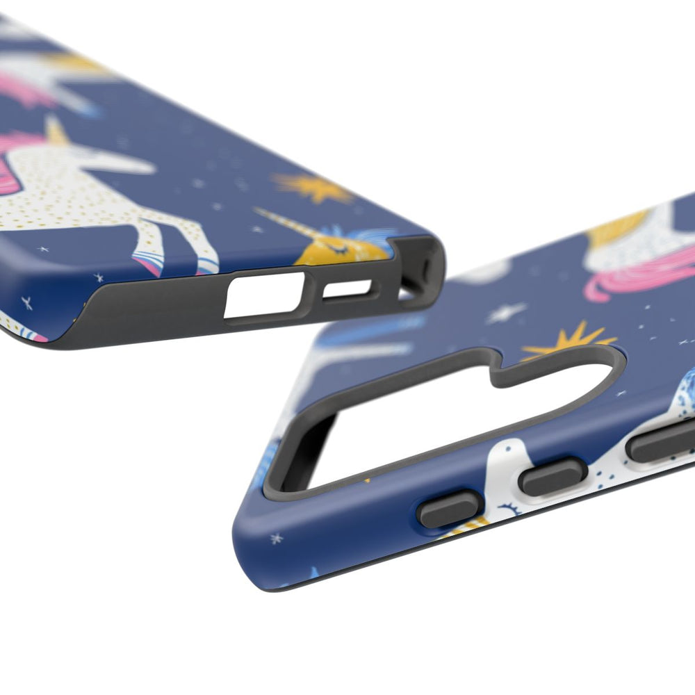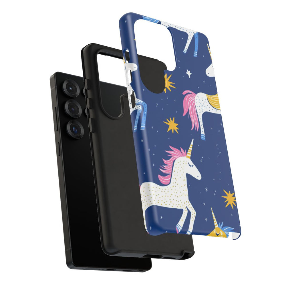 Dit telefoonhoesje heeft een vrolijk patroon van eenhoorns in verschillende kleuren, zoals wit, geel en blauw, met roze en blauwe manen en staarten. De eenhoorns hebben gouden hoorns en worden omringd door gele sterren en kleine witte stipjes op een diepblauwe achtergrond. Het ontwerp is speels en fantasierijk, uitgevoerd in een blokdrukstijl met heldere, contrasterende kleuren. Het stevige hoesje bestaat uit twee lagen en ondersteunt draadloos opladen.