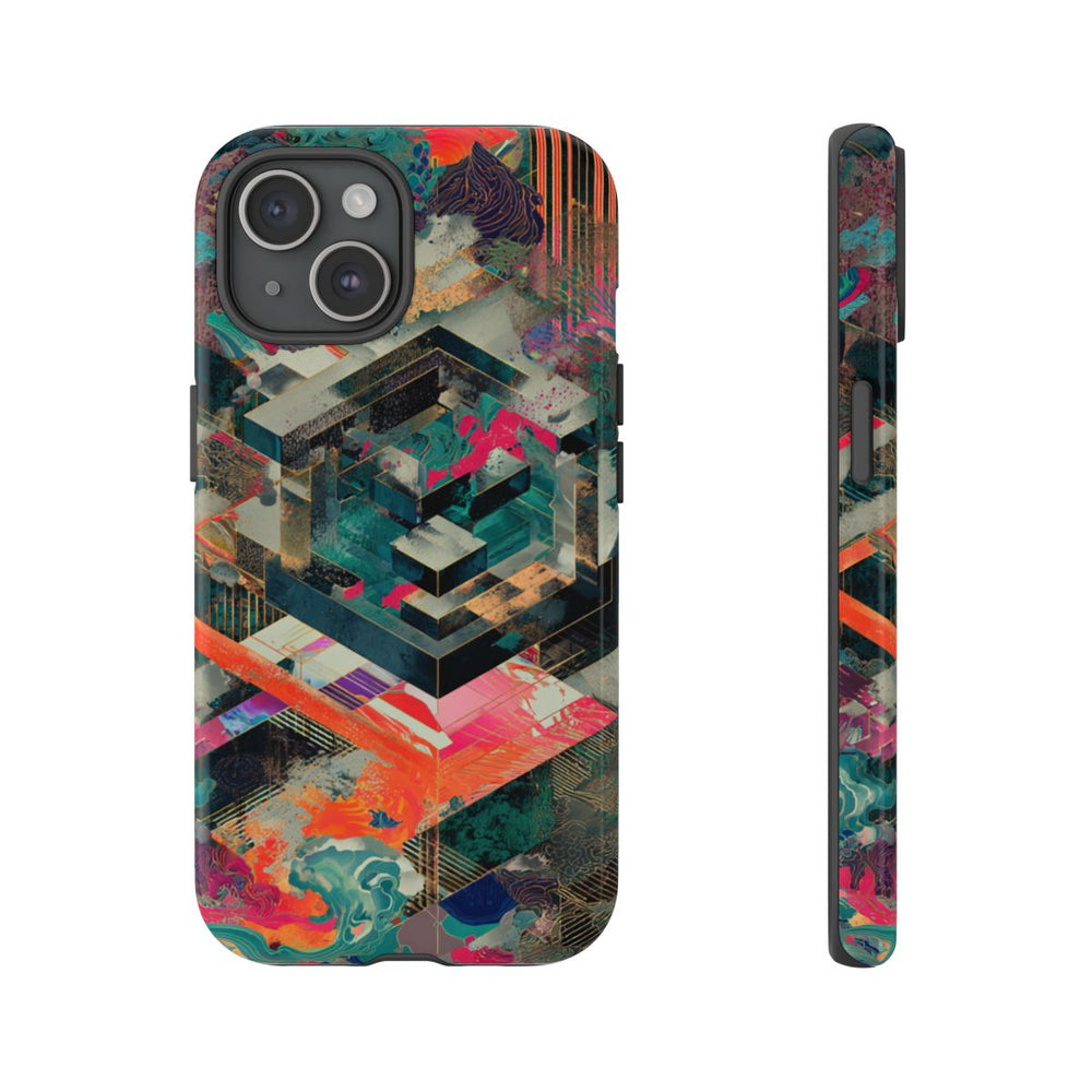 Dit telefoonhoesje heeft een opvallend abstract ontwerp met geometrische vormen en gelaagde structuren. Heldere kleuren zoals teal, roze, oranje en goud komen samen met donkergroene en zwarte achtergronden. Fijne lijnen, patronen en vloeiende vormen zorgen voor diepte en dynamiek. Het hoesje bestaat uit een stevige dubbele laag van polycarbonaat en TPU, wat extra duurzaamheid en bescherming biedt. Geschikt voor draadloos opladen. De stijl is modern en artistiek.